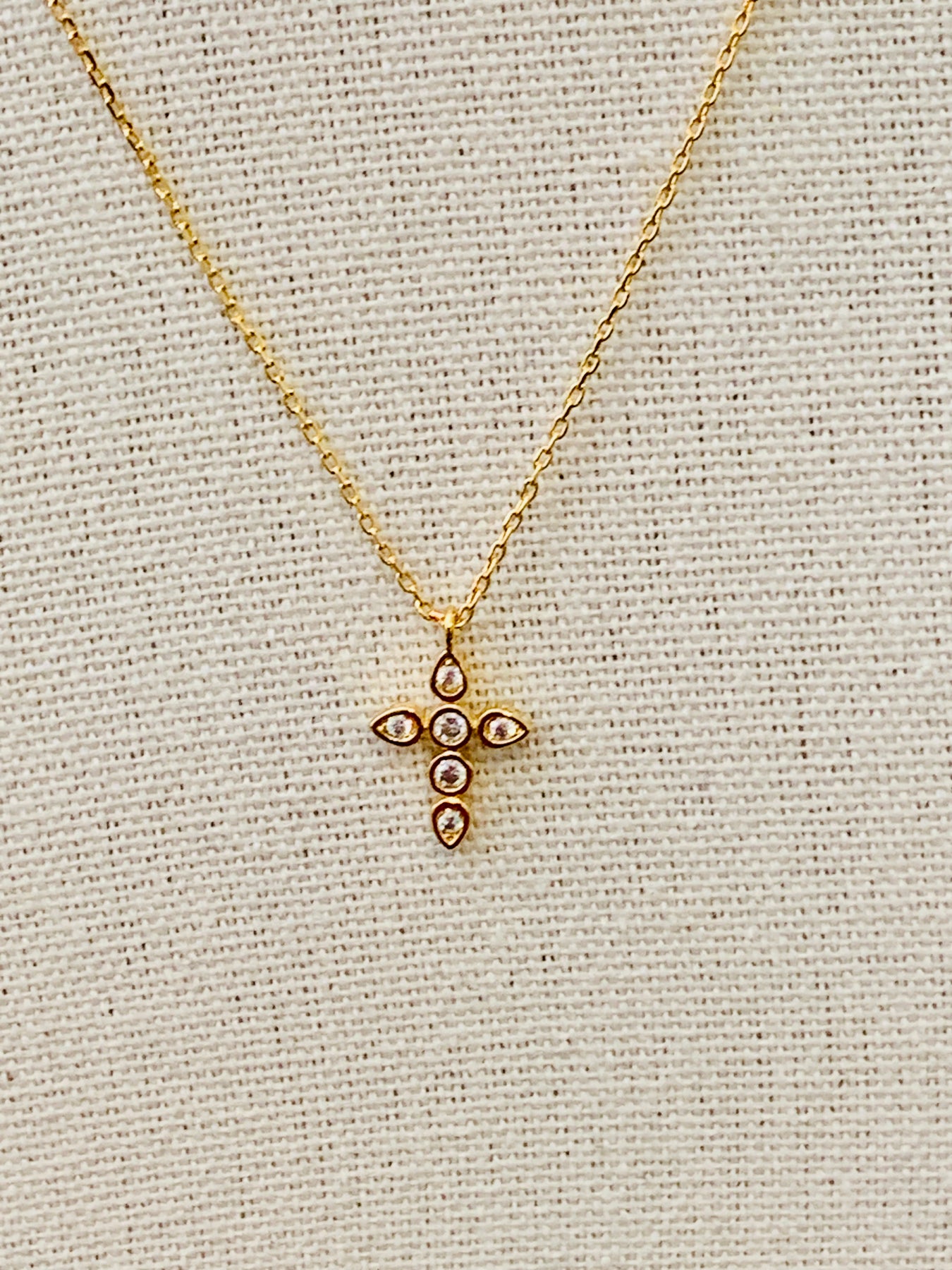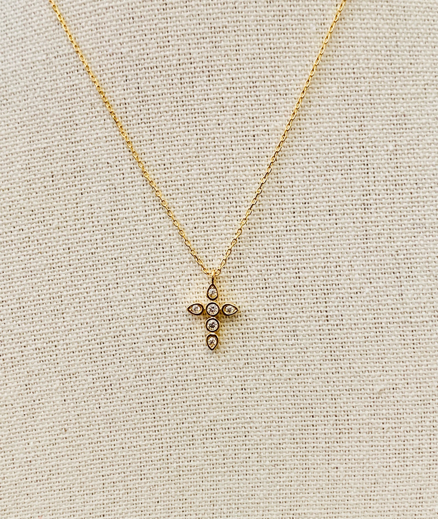 Gold cross pendant with embedded cubic zirconias on a beige background