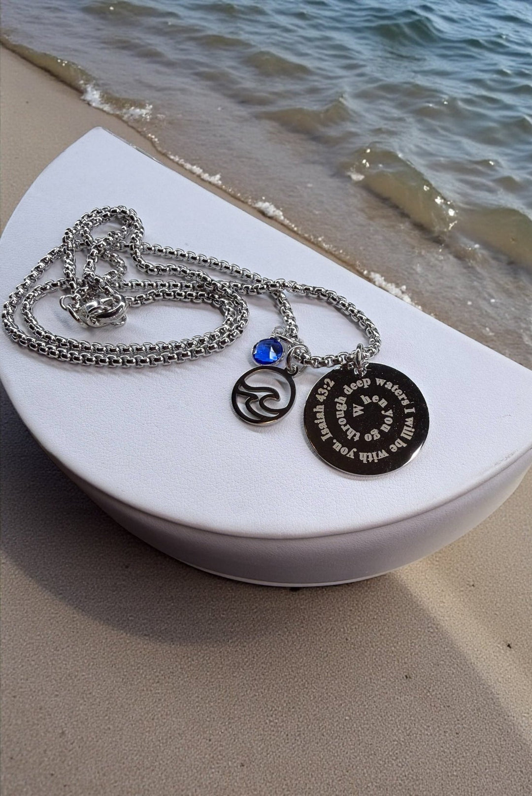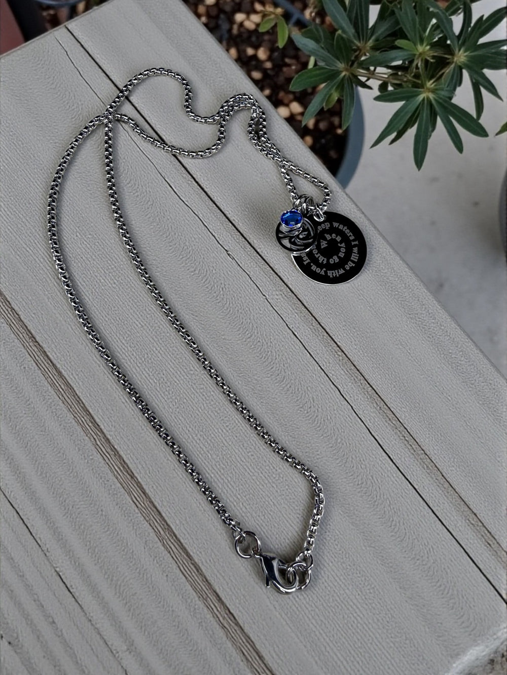 Navy blue background w/ silver stainless