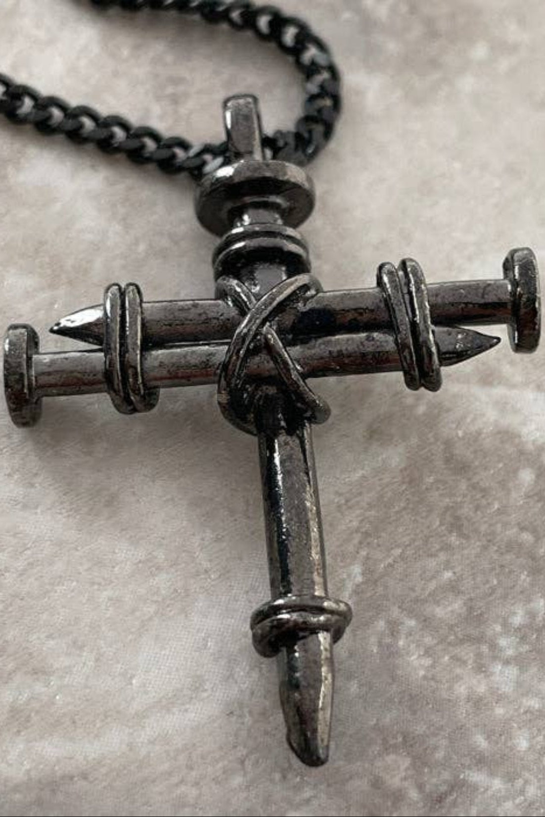 Stand strong in your faith with this Gunmetal Nail Cross Necklace on a 24" stainless steel curb chain. Crafted from three rugged nails wrapped in wire, this bold pendant symbolizes unwavering belief and the ultimate sacrifice. The heavy-duty stainless steel chain won’t rust or tarnish, so you can wear this meaningful piece every day as a personal reminder of strength, redemption, and hope.
