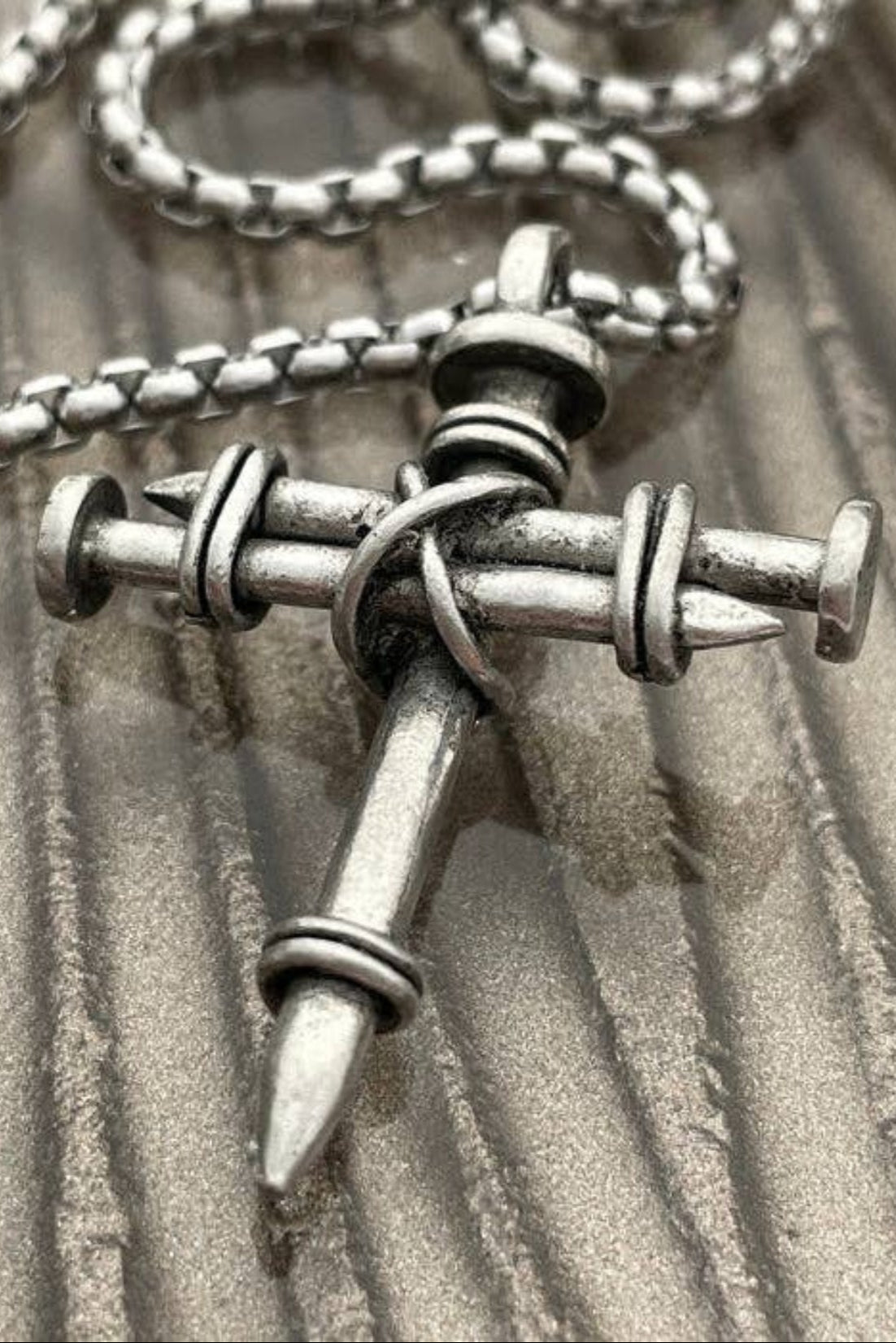 Carry a powerful reminder of faith and sacrifice with this Pewter Nail Cross Necklace on a 24" heavy stainless steel box chain. Featuring three rugged nails wrapped in wire and finished in antique pewter, this bold pendant symbolizes strength, redemption, and unwavering belief. The sturdy stainless steel chain won’t rust or tarnish, making this meaningful piece a lasting companion on your faith journey or a heartfelt gift for someone you love.