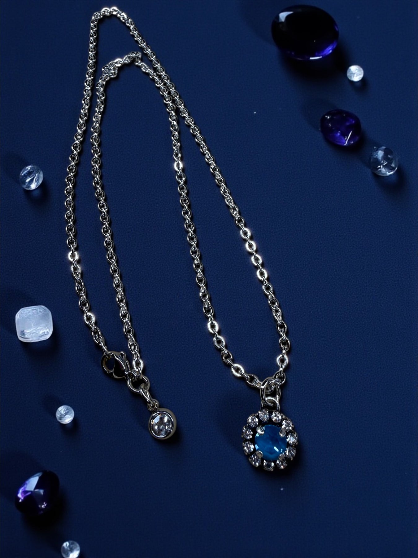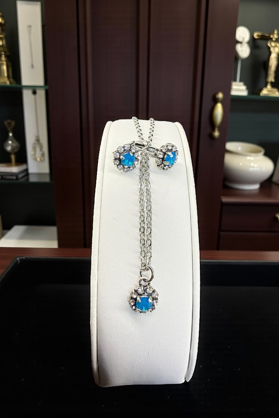 • Necklace and earrings have a round antique silver-toned setting with a 6 mm Teal Ignite crystal stone surrounded by rhinestones