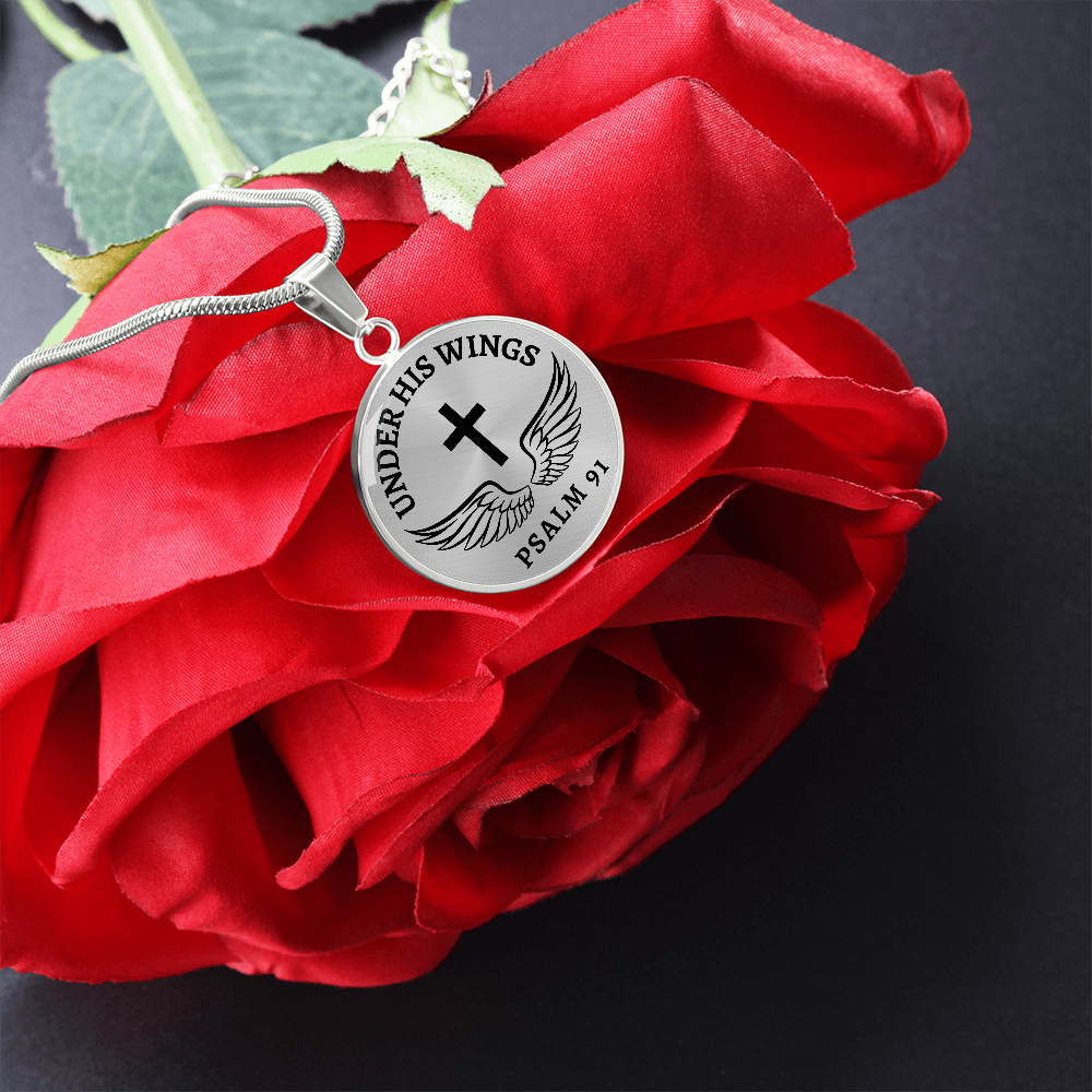 This beautiful Under His Wings Psalm 91 circle pendant necklace is made with high-quality surgical steel with a shatterproof coating. Choose either the stainless or 18k gold finish. It also comes with a free gift box to store your necklace or gift to a loved one.