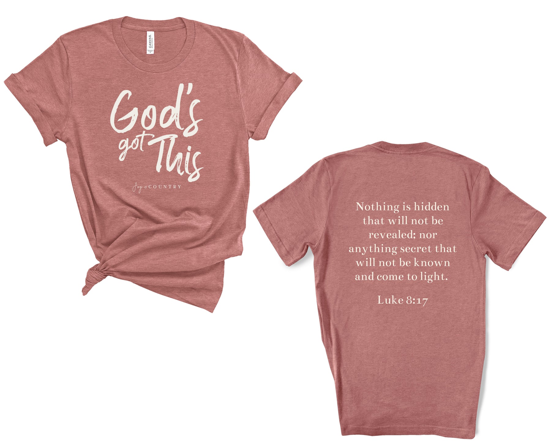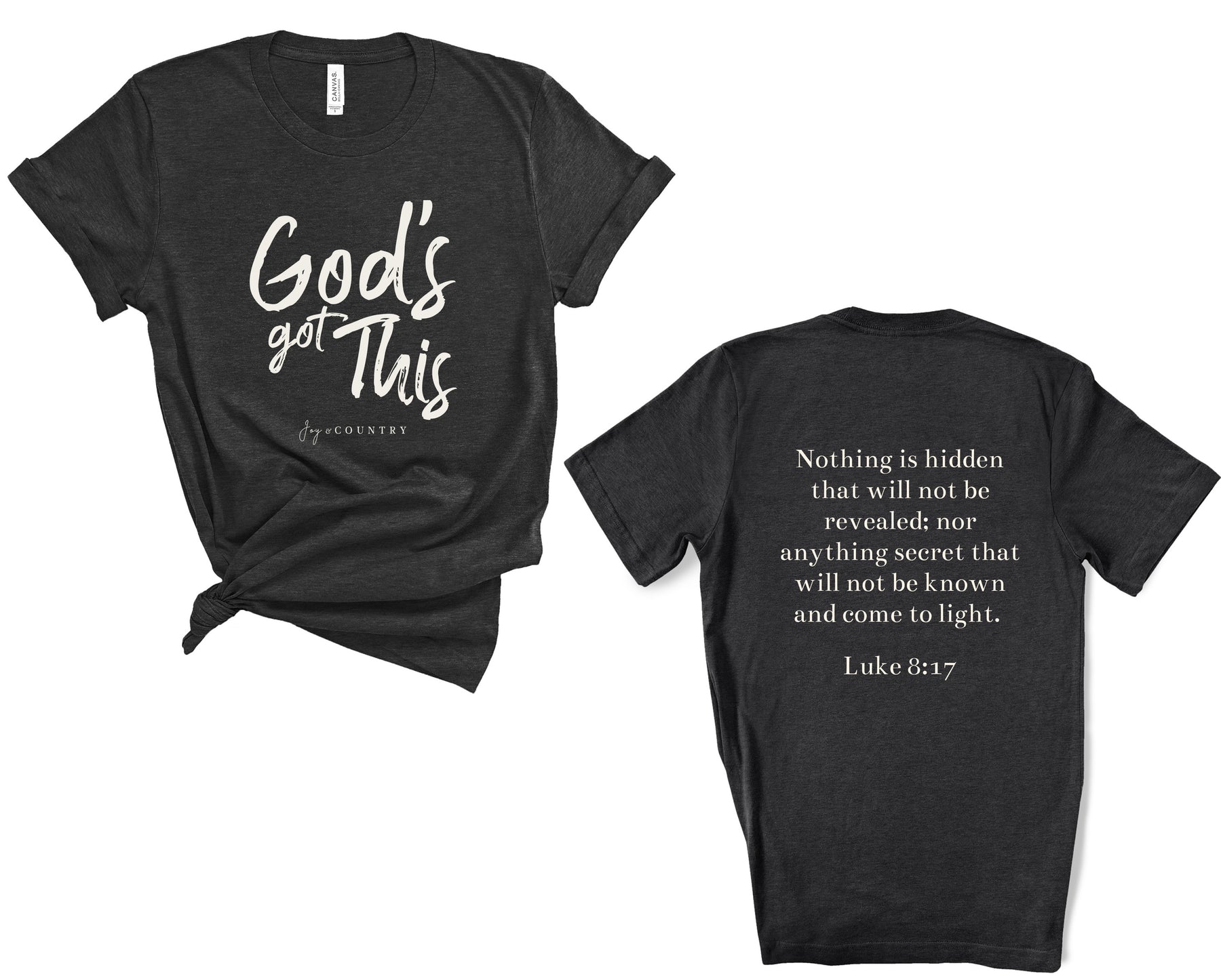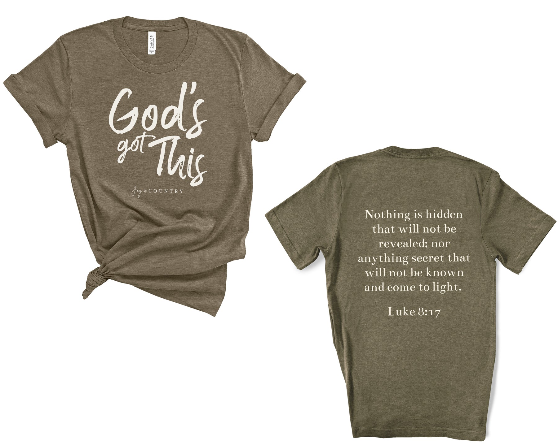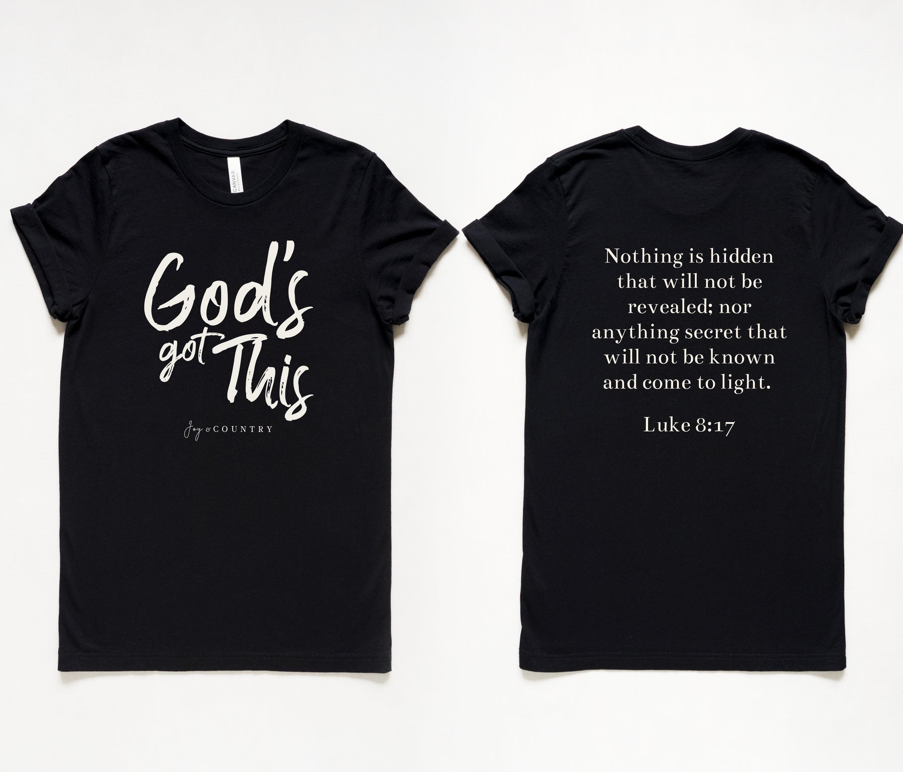 This is our 2-sided God's Got This tee with Luke 8:17 on the back! Sometimes you just need to be reminded that God's got this! He is our provider, healer, and deliverer, and everything that needs to be revealed will be revealed! God's Got This!