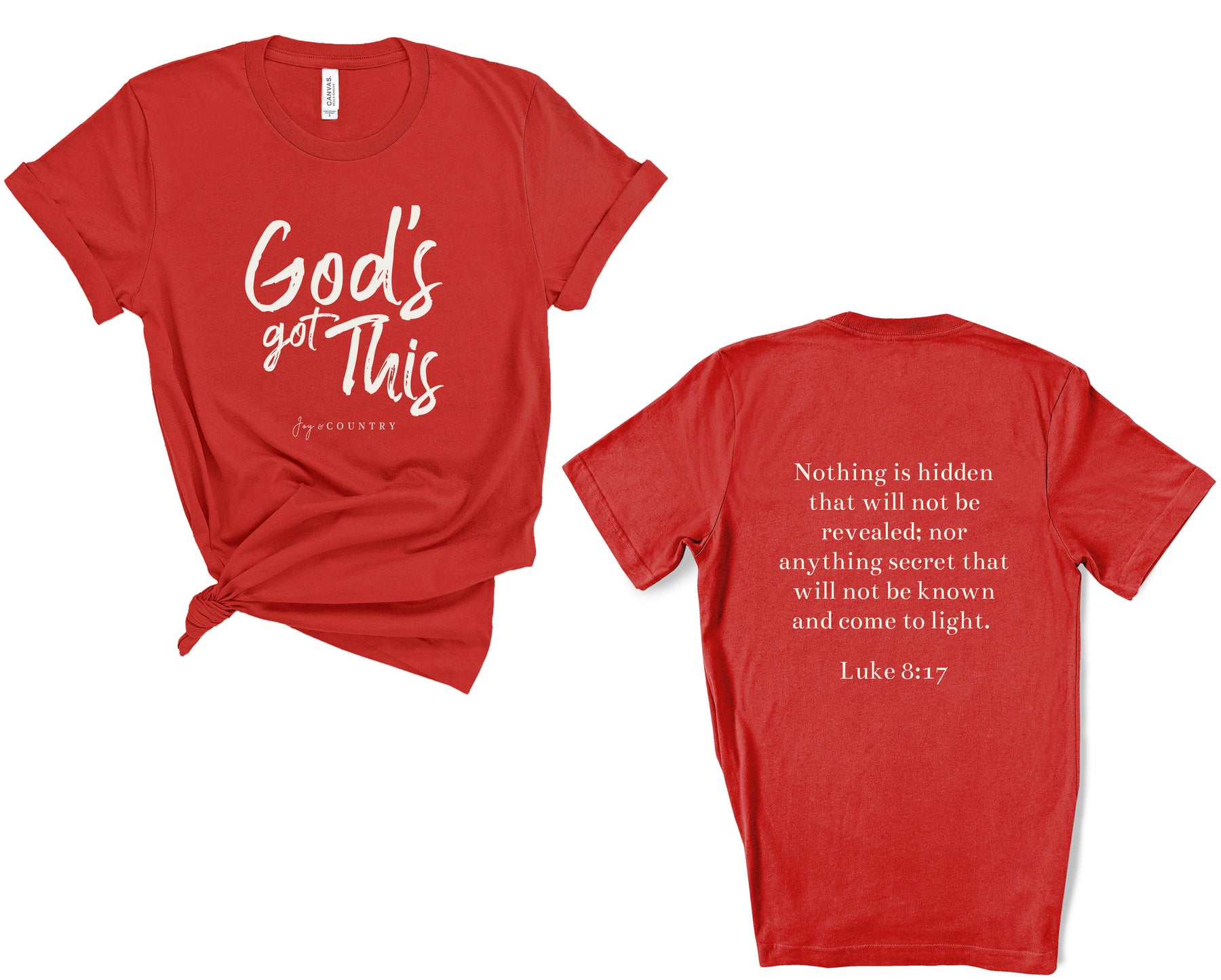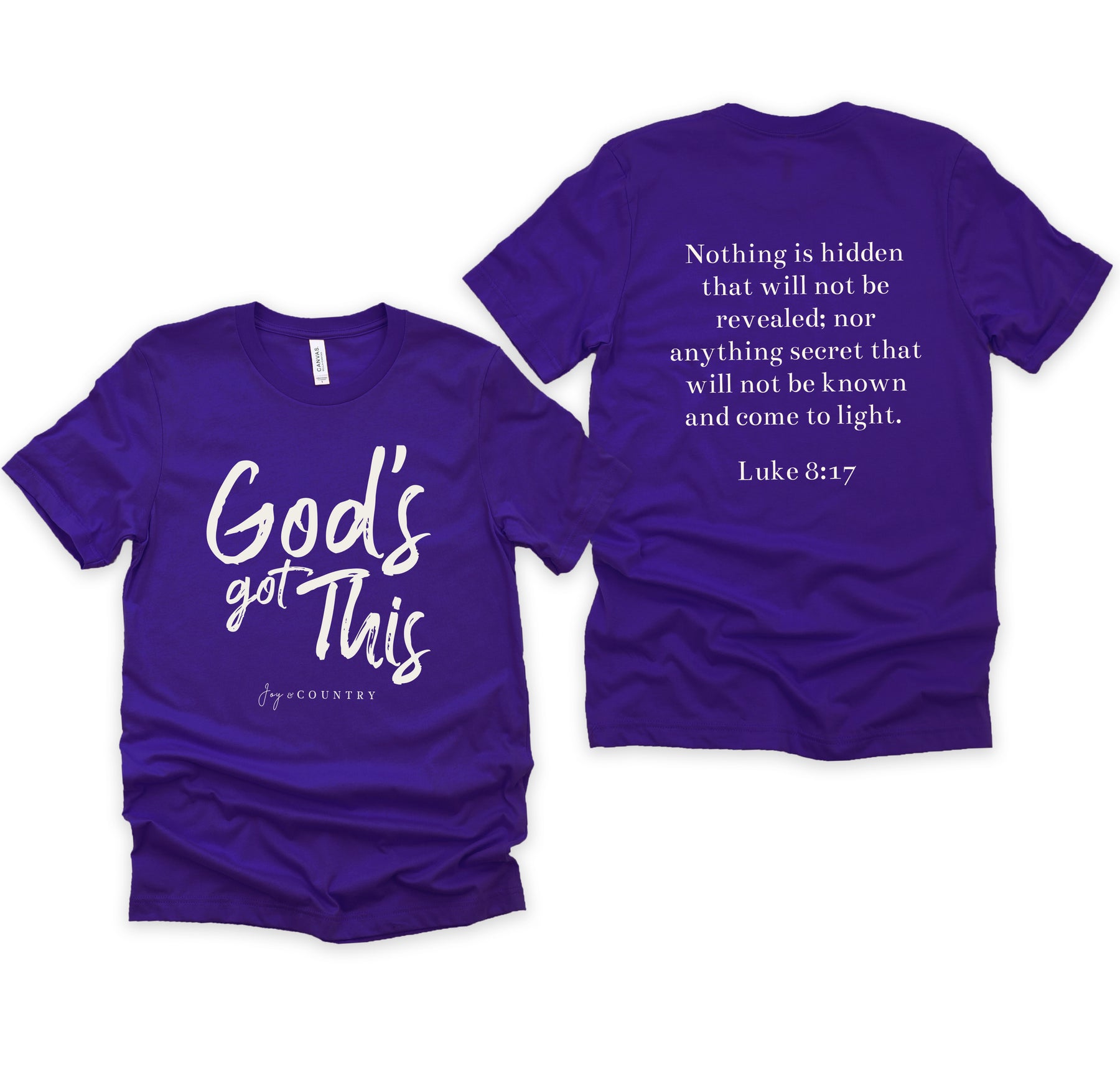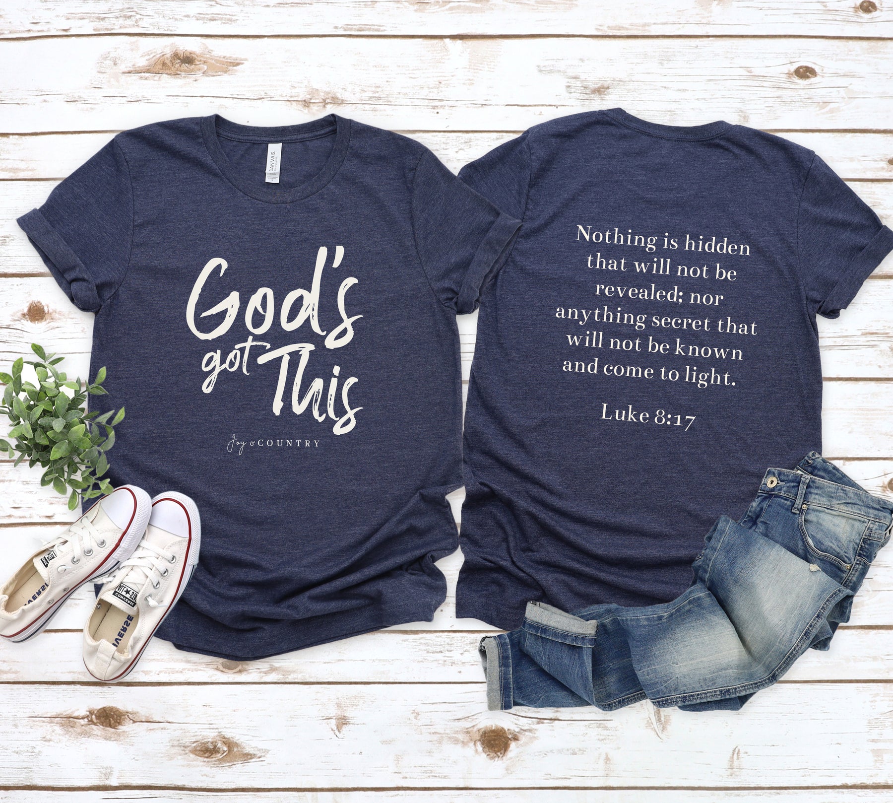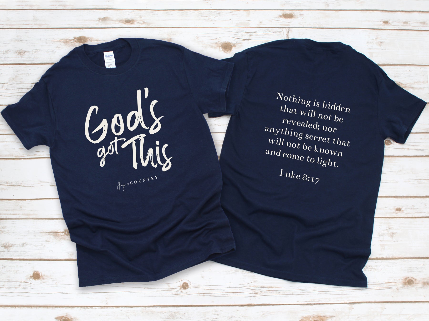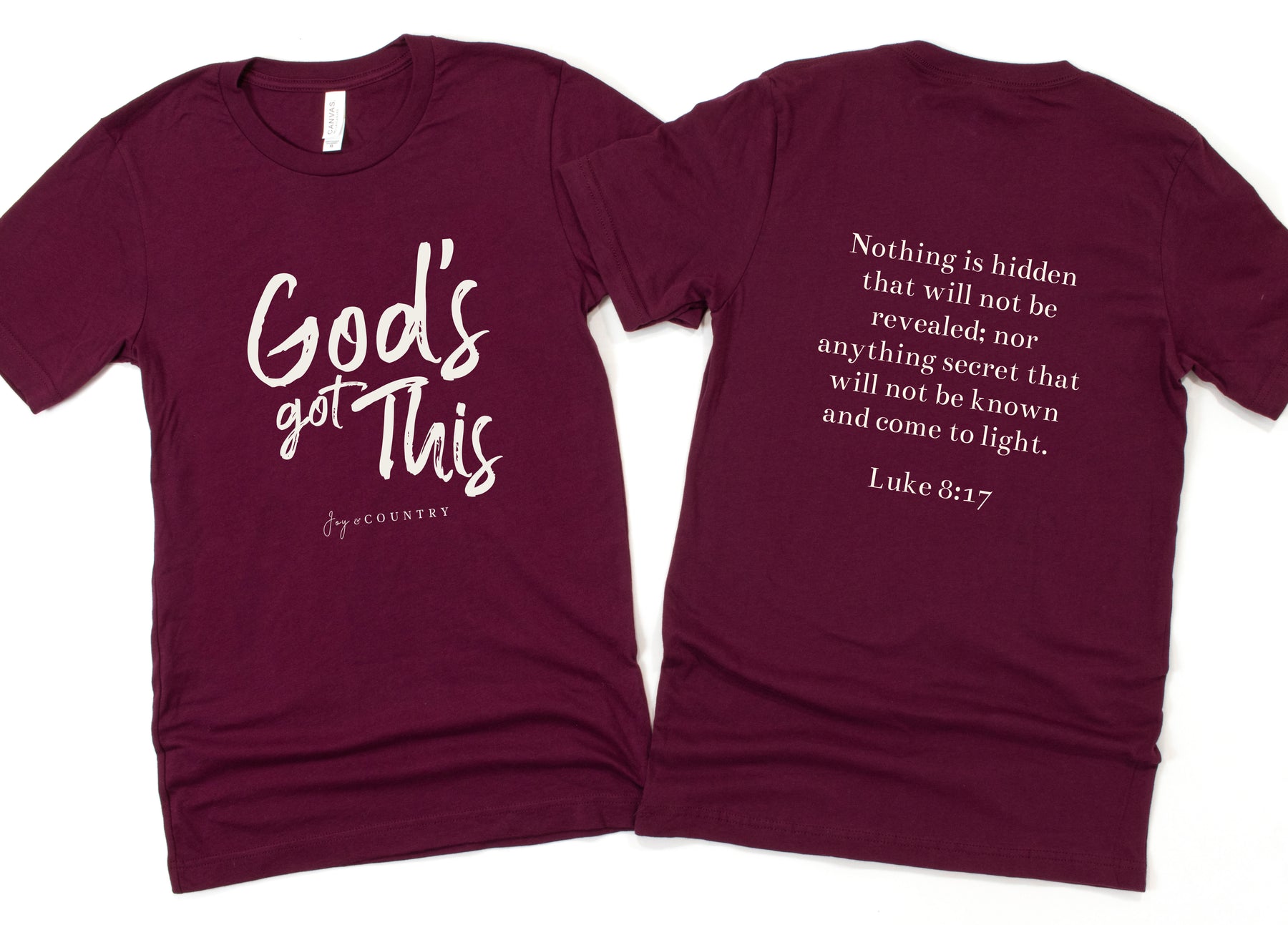 This is our 2-sided God's Got This tee with Luke 8:17 on the back! Sometimes you just need to be reminded that God's got this! He is our provider, healer, and deliverer, and everything that needs to be revealed will be revealed! God's Got This!