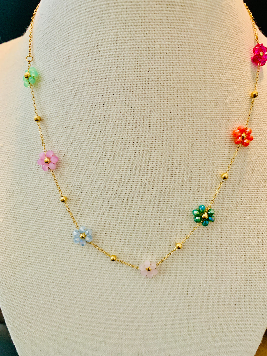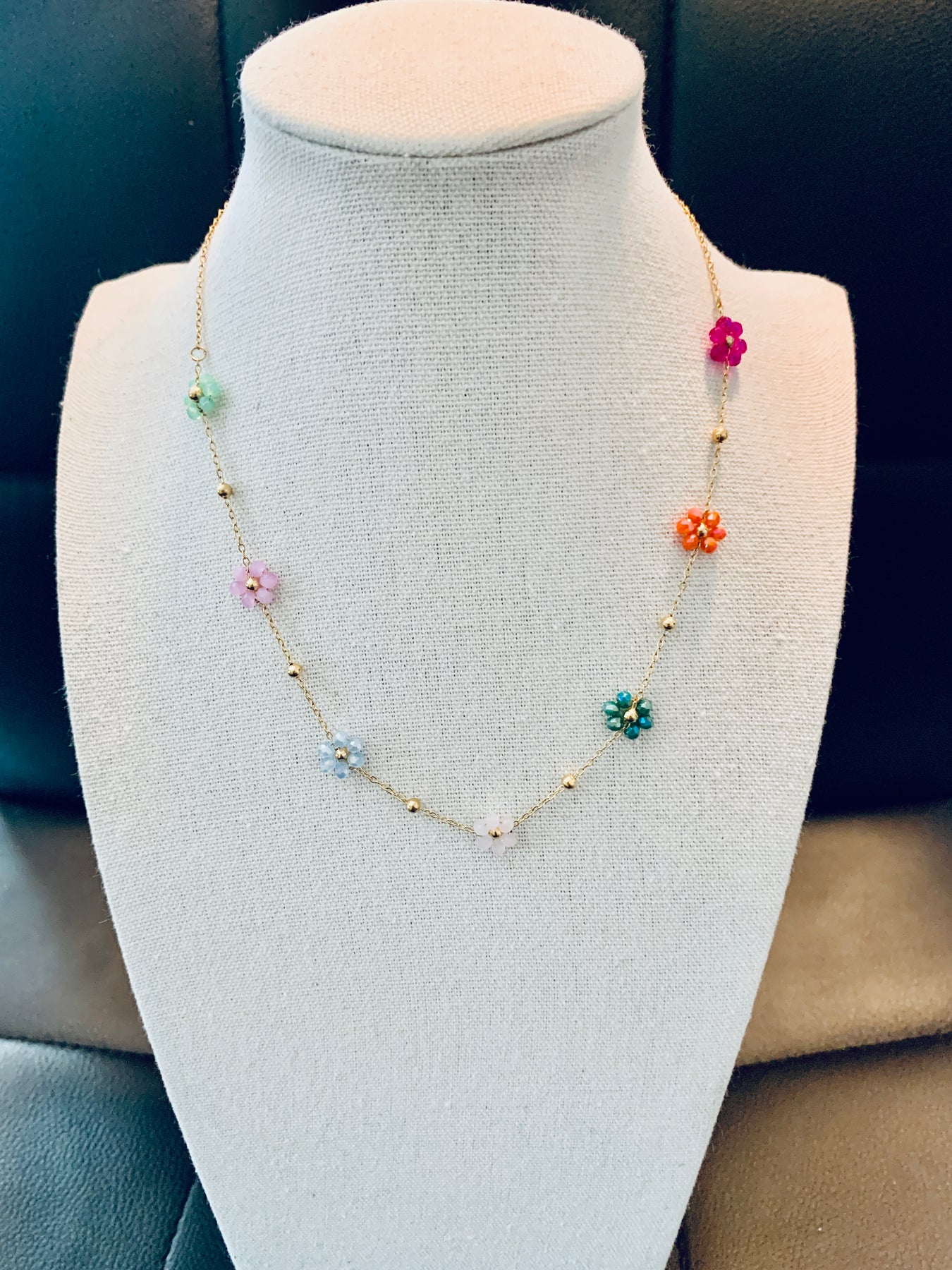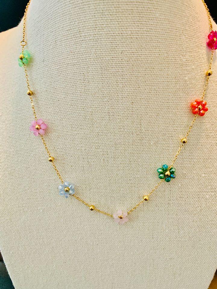 Bring a touch of nature's beauty to your style with this stunning floral-inspired necklace. Featuring delicate, multicolored sparkling flowers, this elegant piece adds a vibrant and sophisticated charm to any outfit. Perfect for any occasion, it’s designed to make a statement and captivate attention.
