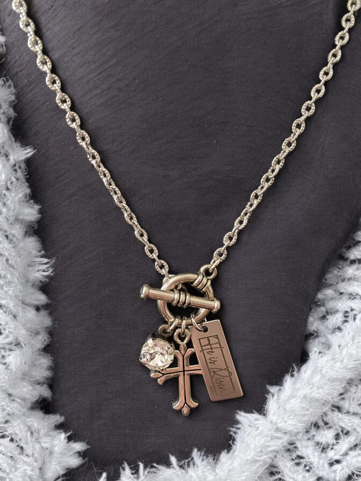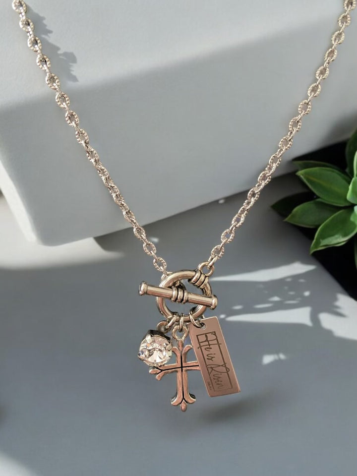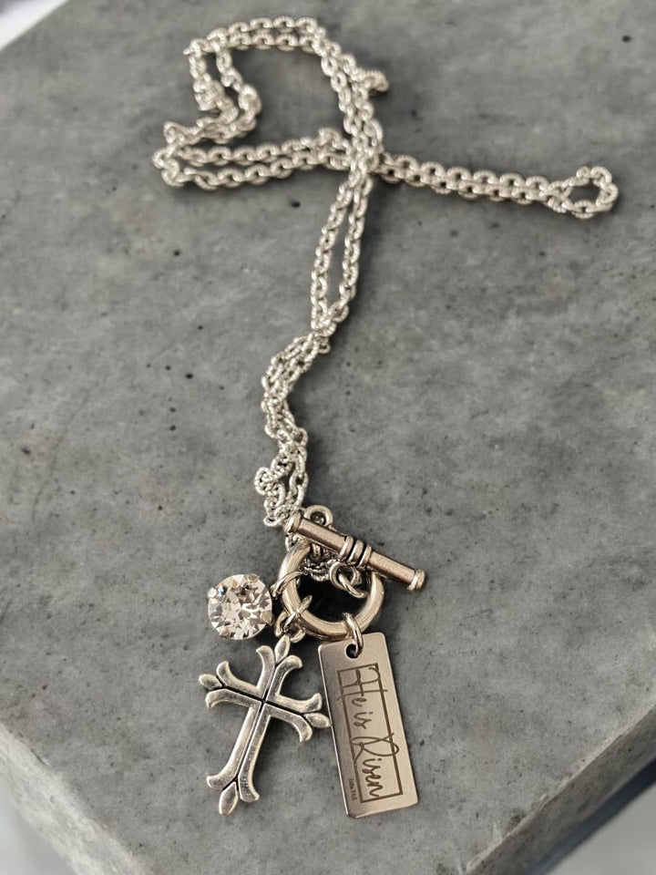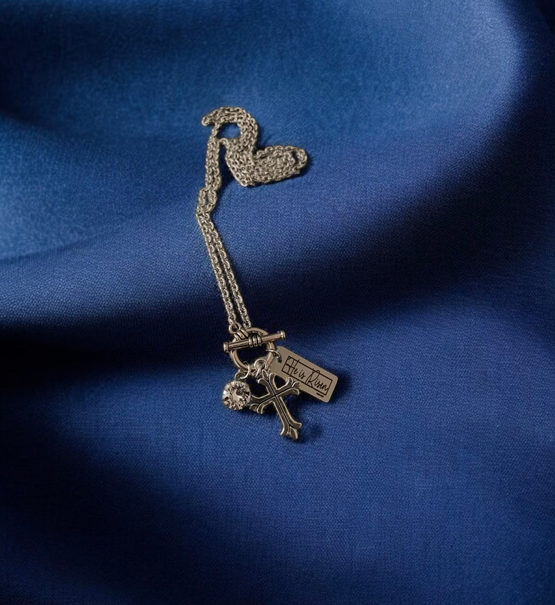Wear your faith near your heart and declare that He is risen with this powerful and inspiring necklace! This lovely necklace includes a beautiful Cross, a charm that says "He is Risen" and a clear Austrian crystal to represent the open tomb.