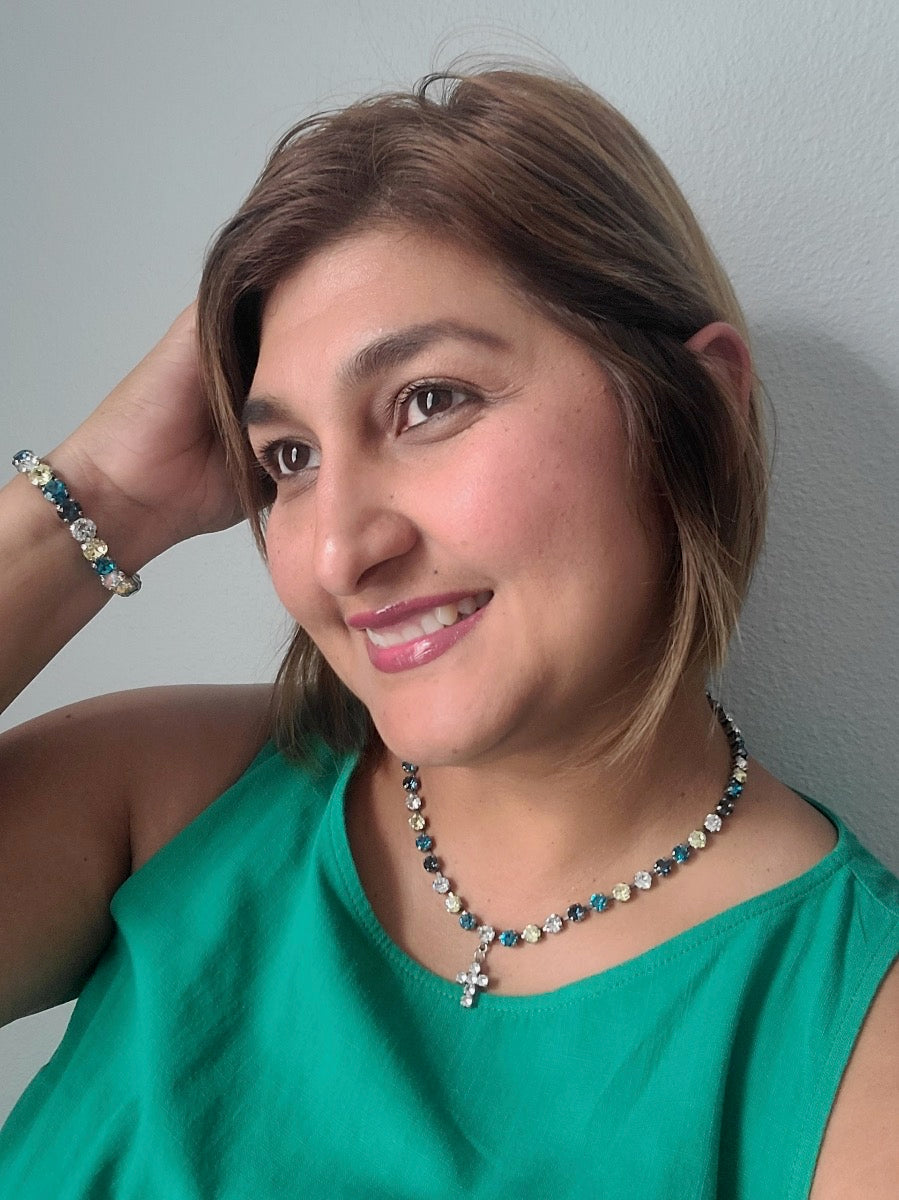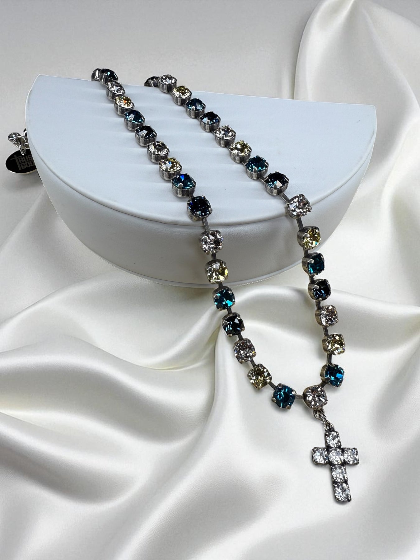 Let this dazzling handcrafted Austrian Crystal necklace lift your spirits and light up your look day and night. Crafted by a local artisan, this charming necklace adds sparkle to any outfit and makes a heartfelt gift. Featuring vibrant Austrian crystals and a rhinestone Cross, it’s a joyful reminder of Jesus’ love. Plus, a "Trust God" charm keeps faith close, encouraging you to lean on Him no matter what comes your way.