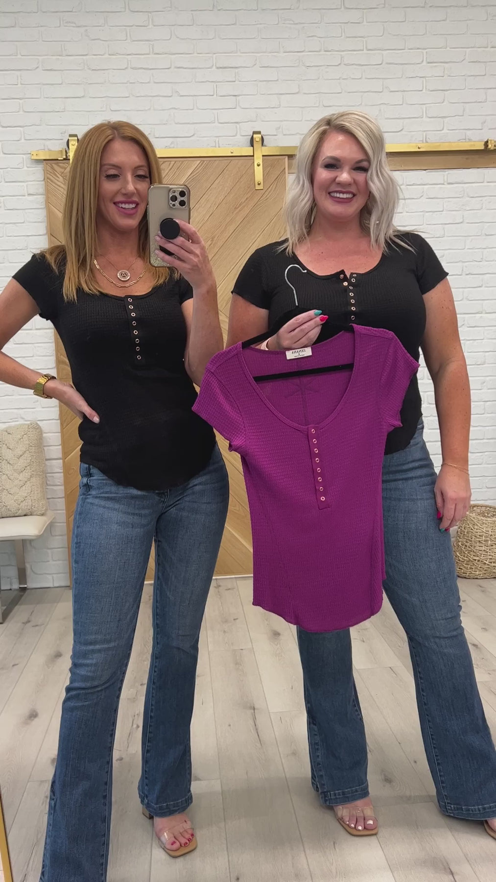 The Baby Waffle Cap Sleeve Henley is truly inspiring for special occasions. Its soft baby waffle knit fabric, scoop neckline, functioning rose gold snaps, slim fit, contour seaming, and raw hem are all the details you need to turn heads with confidence. Plus, an elegant patch on the back is perfect for adding a subtle touch of style!