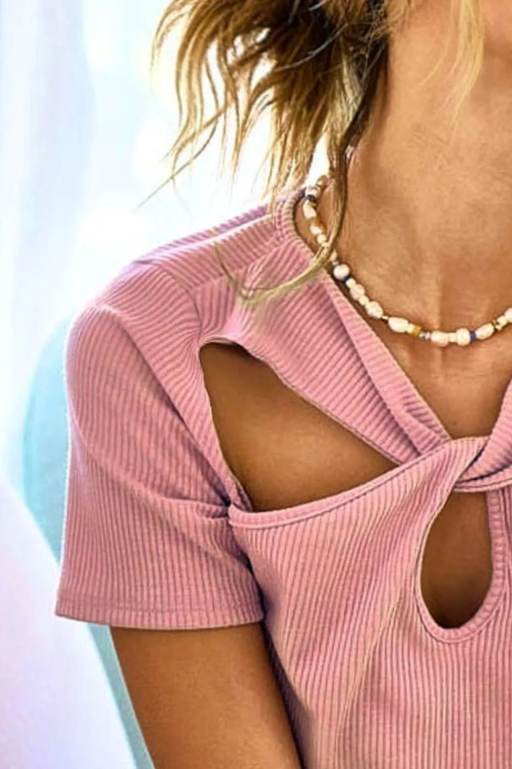 Add a trendy and stylish touch to your wardrobe with this unique rib knit top featuring a textured ribbed fabric, cut-out, and front twist detailing. Perfect for any occasion, pair it with high-waisted jeans or a skirt for a chic and modern look.