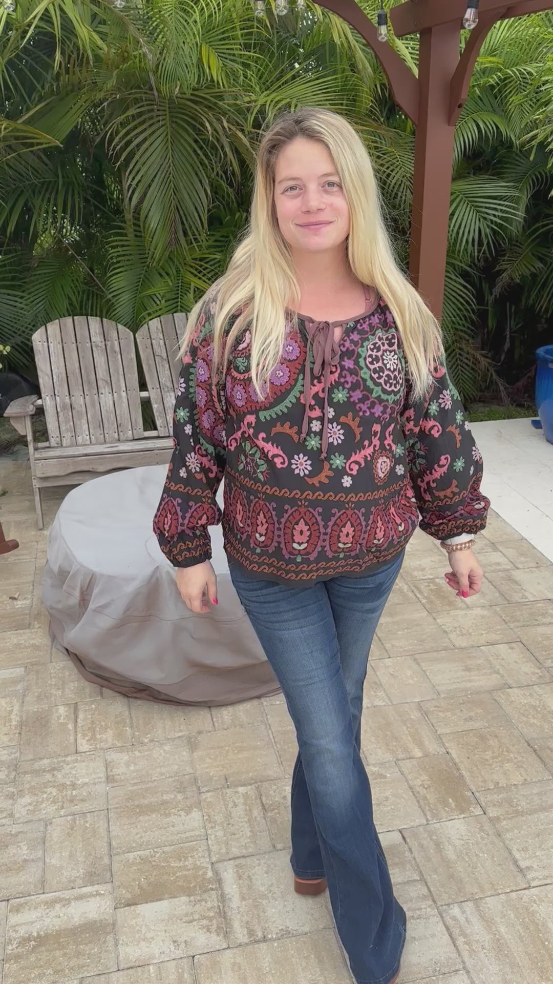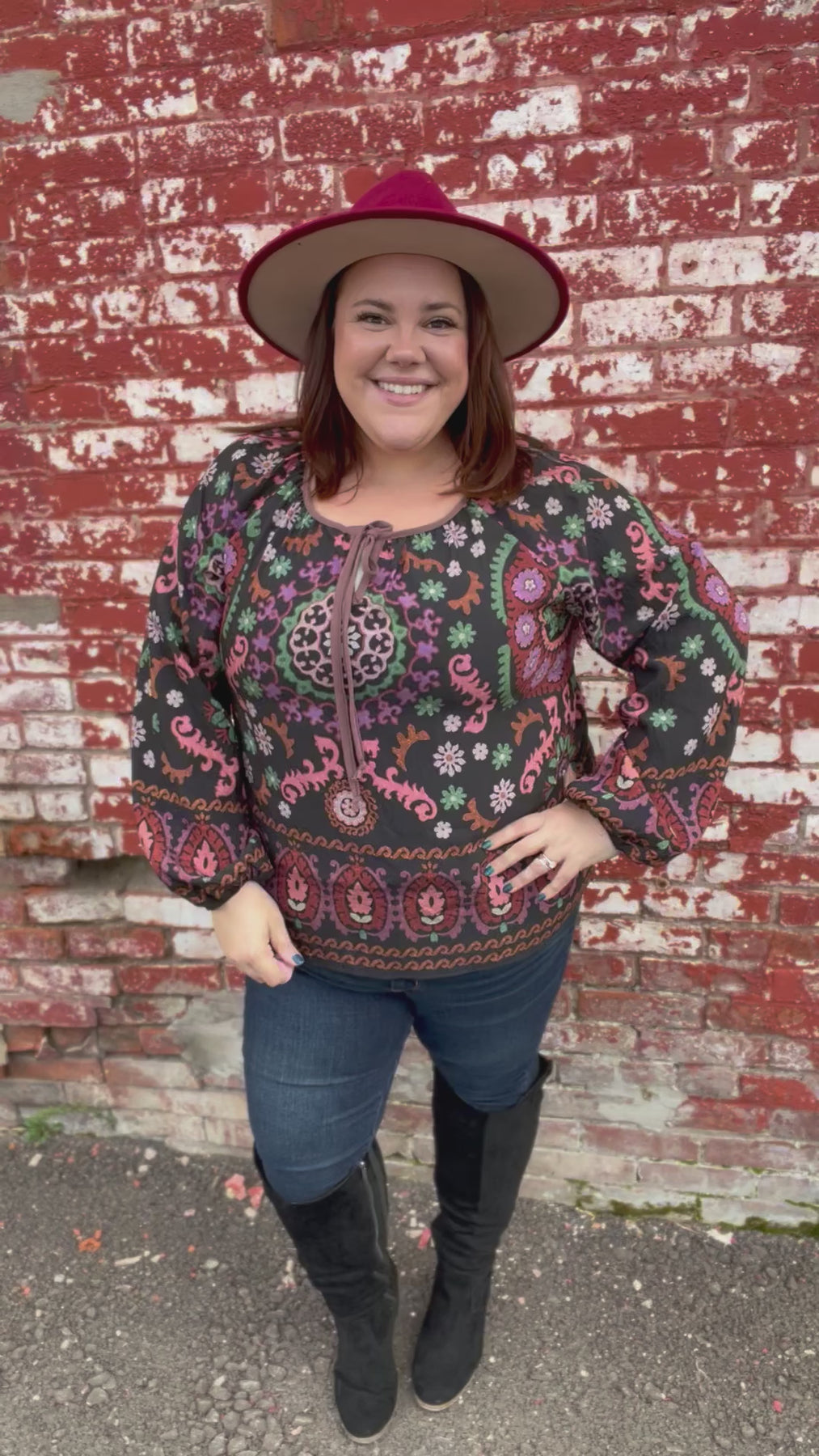 Make a fashion statement this season while staying cozy in this woven border print top with keyhole front tie strings. With long elastic bubble sleeves, pair with a jean jacket for a statement look.