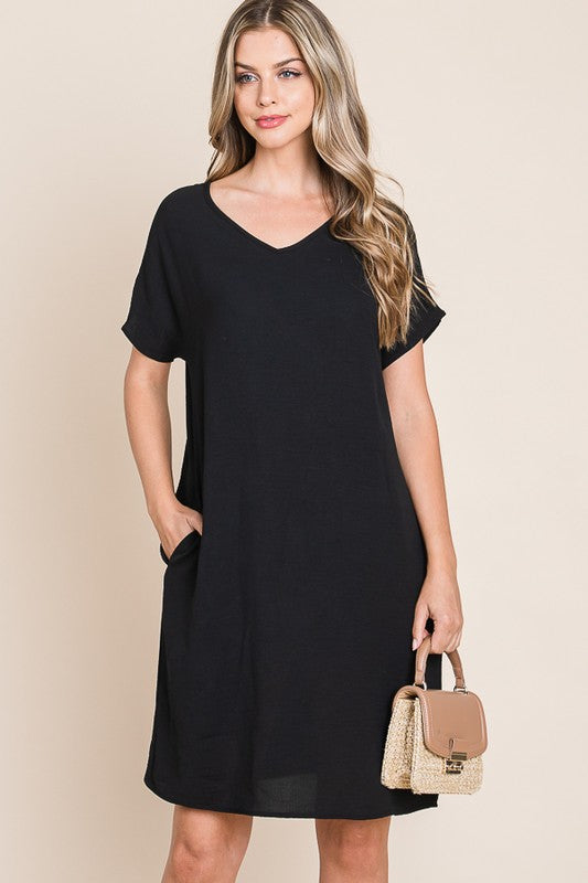 This V-neck short-sleeved dress with pockets is a versatile and stylish addition to your wardrobe. The V-neck design adds a touch of femininity, while the pockets offer both convenience and practicality. Perfect for various occasions, this dress combines fashion and functionality for a chic and effortless look.