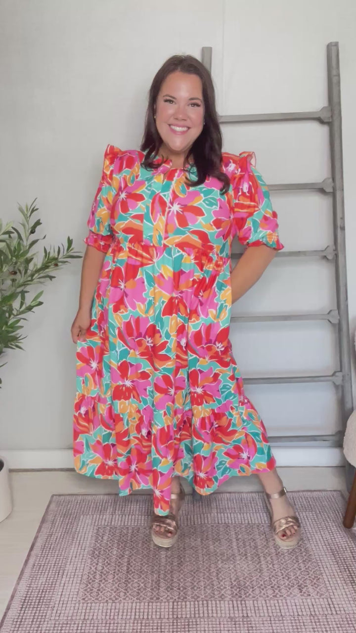 This charming midi dress features a bold orange and aqua floral print, playful smocked ruffle sleeves, and a fun ruffle hem. The notched neckline is accented with delicate crochet details, making it a fun and stylish choice for any occasion.