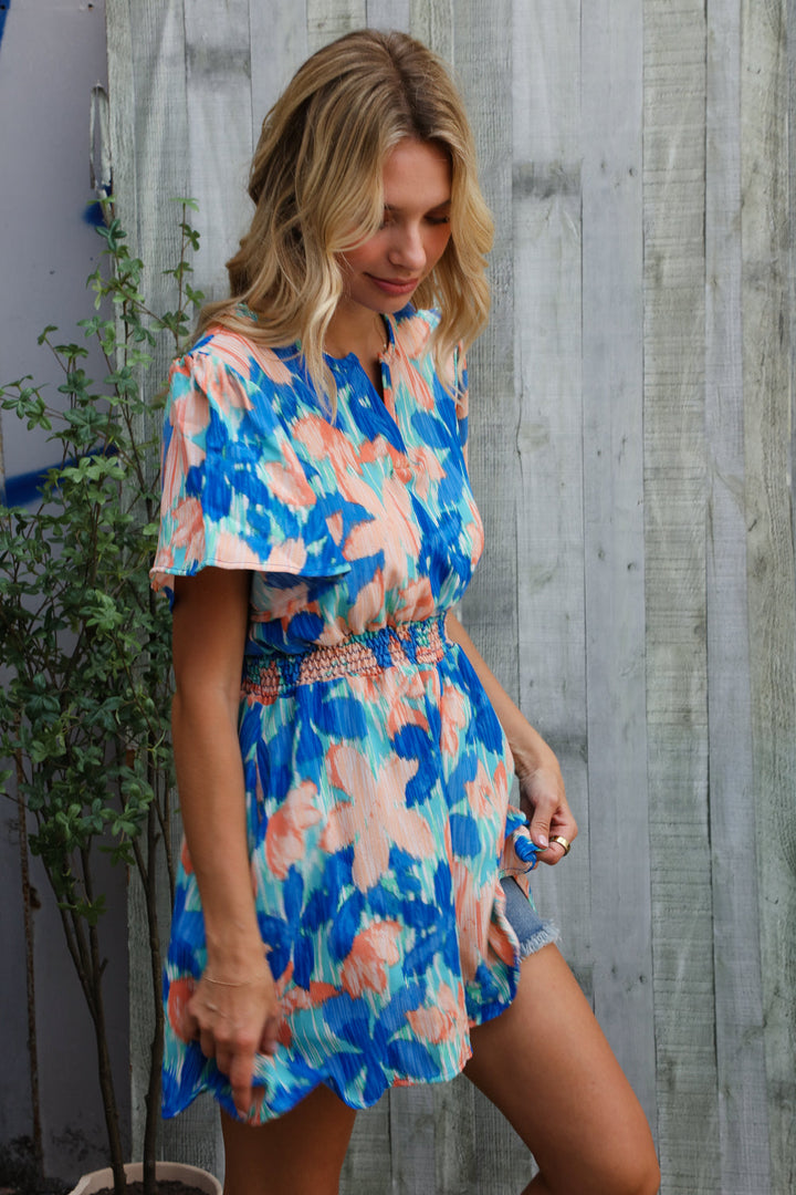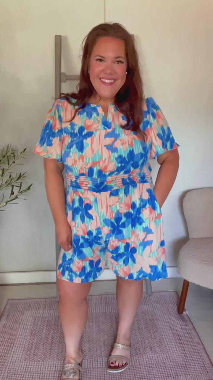 Feeling Bold Turquoise Floral Smocked Waist Flutter Sleeve Romper    Joy & Country