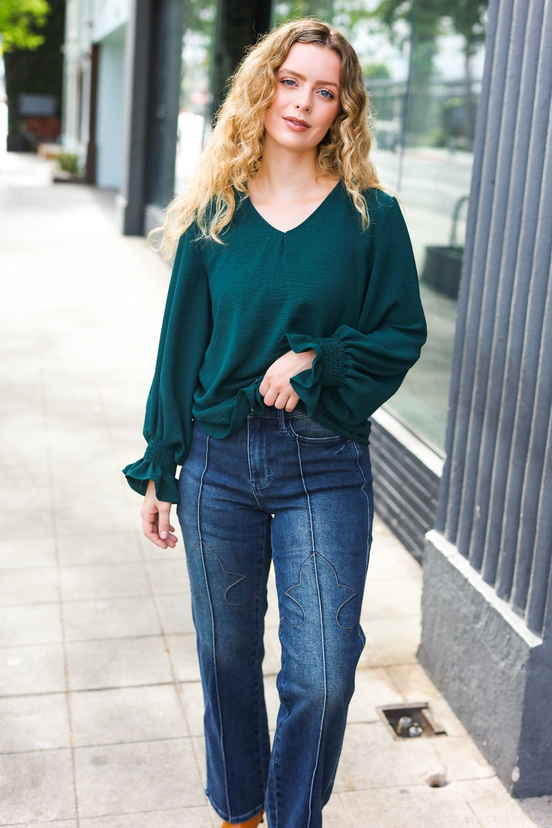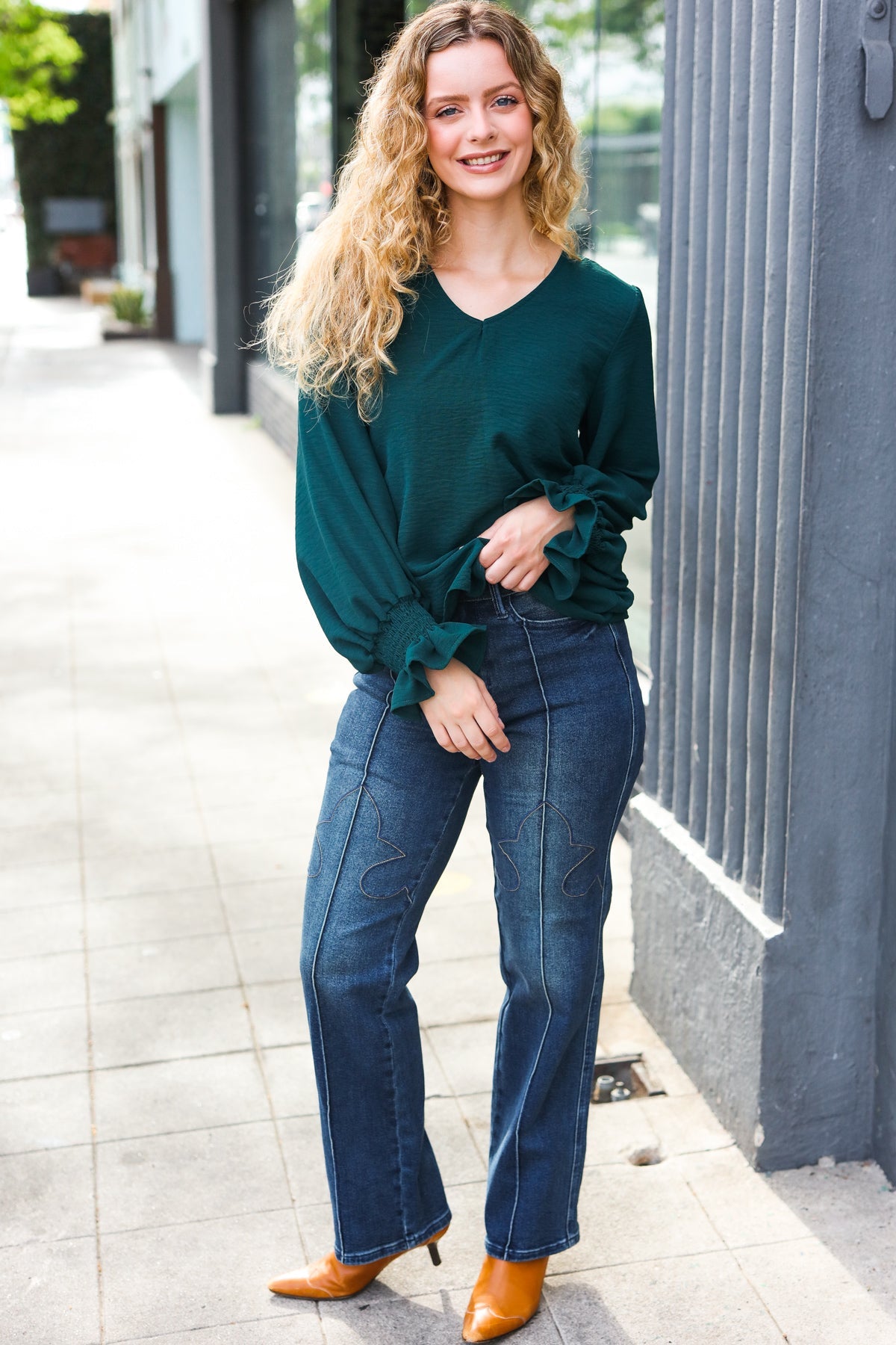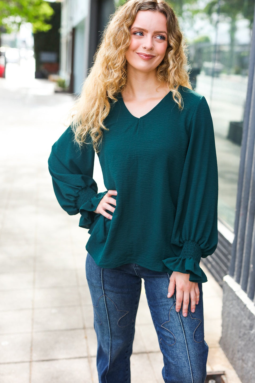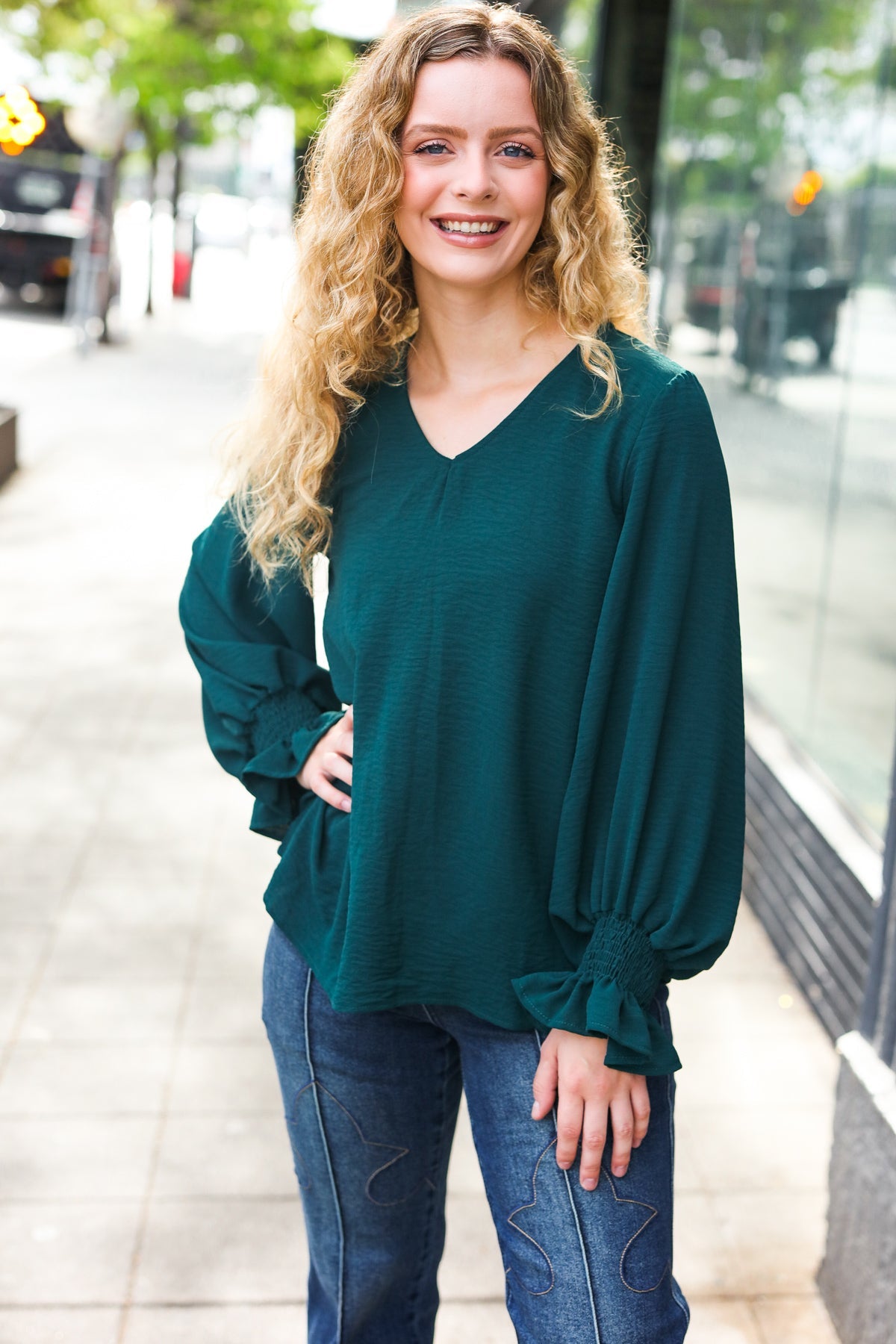 Donning a v-neck and smocked bubble sleeves, this stunning top has a lot of class and a flattering silhouette. Wear with jeans, slacks, or a skirt for the day-to-night style!