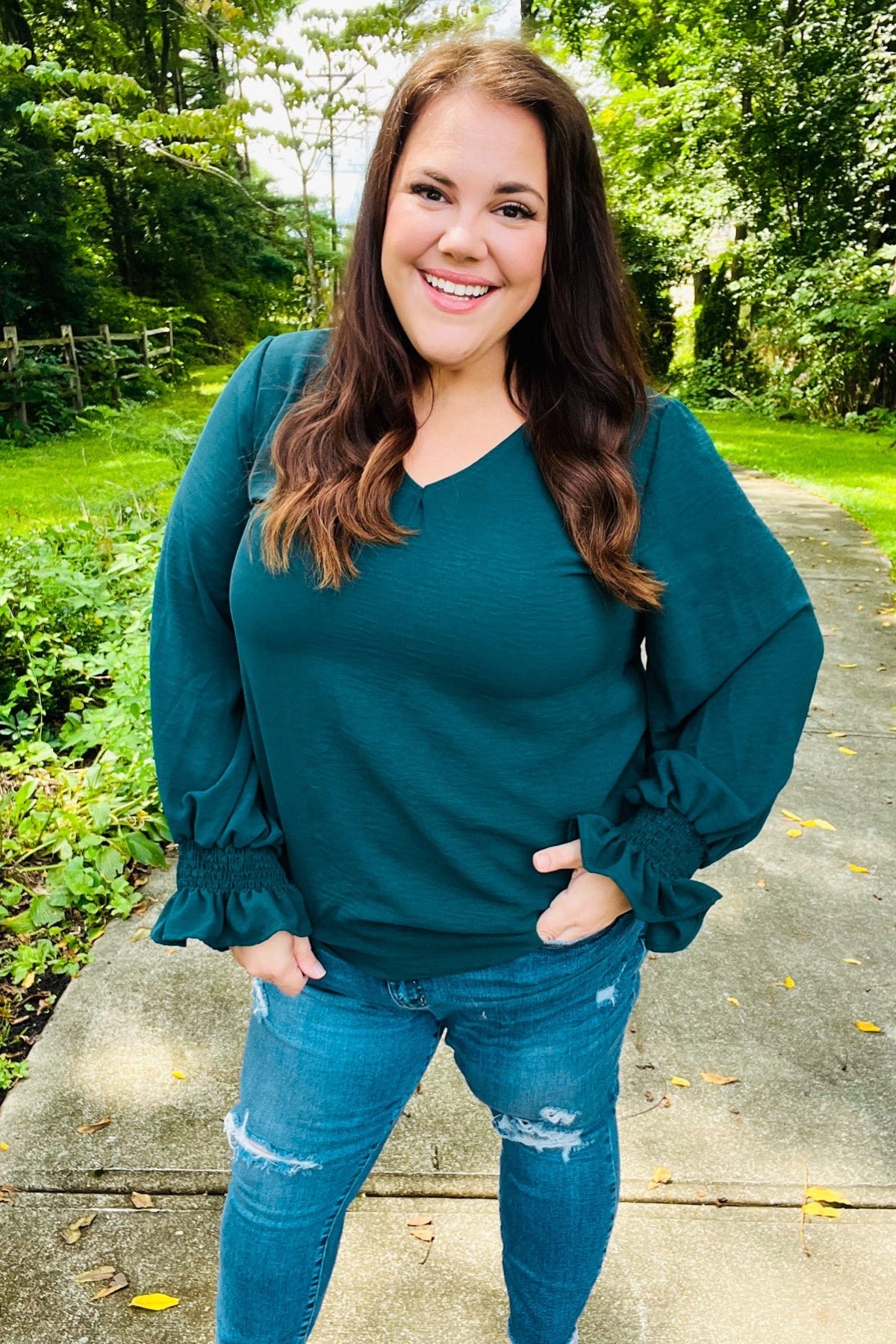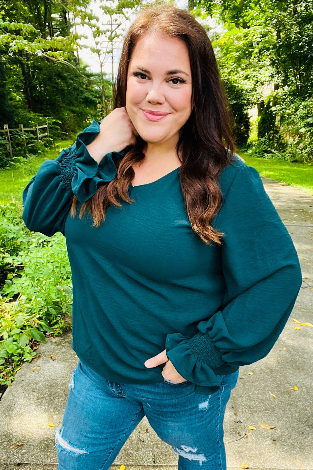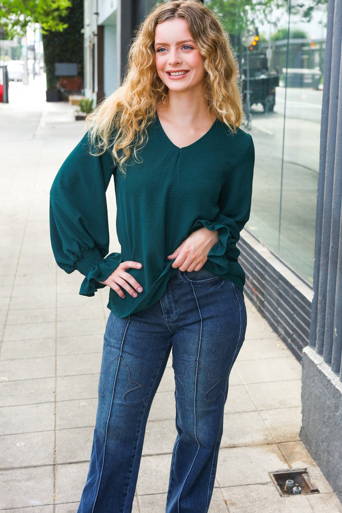 Donning a v-neck and smocked bubble sleeves, this stunning top has a lot of class and a flattering silhouette. Wear with jeans, slacks, or a skirt for the day-to-night style!
