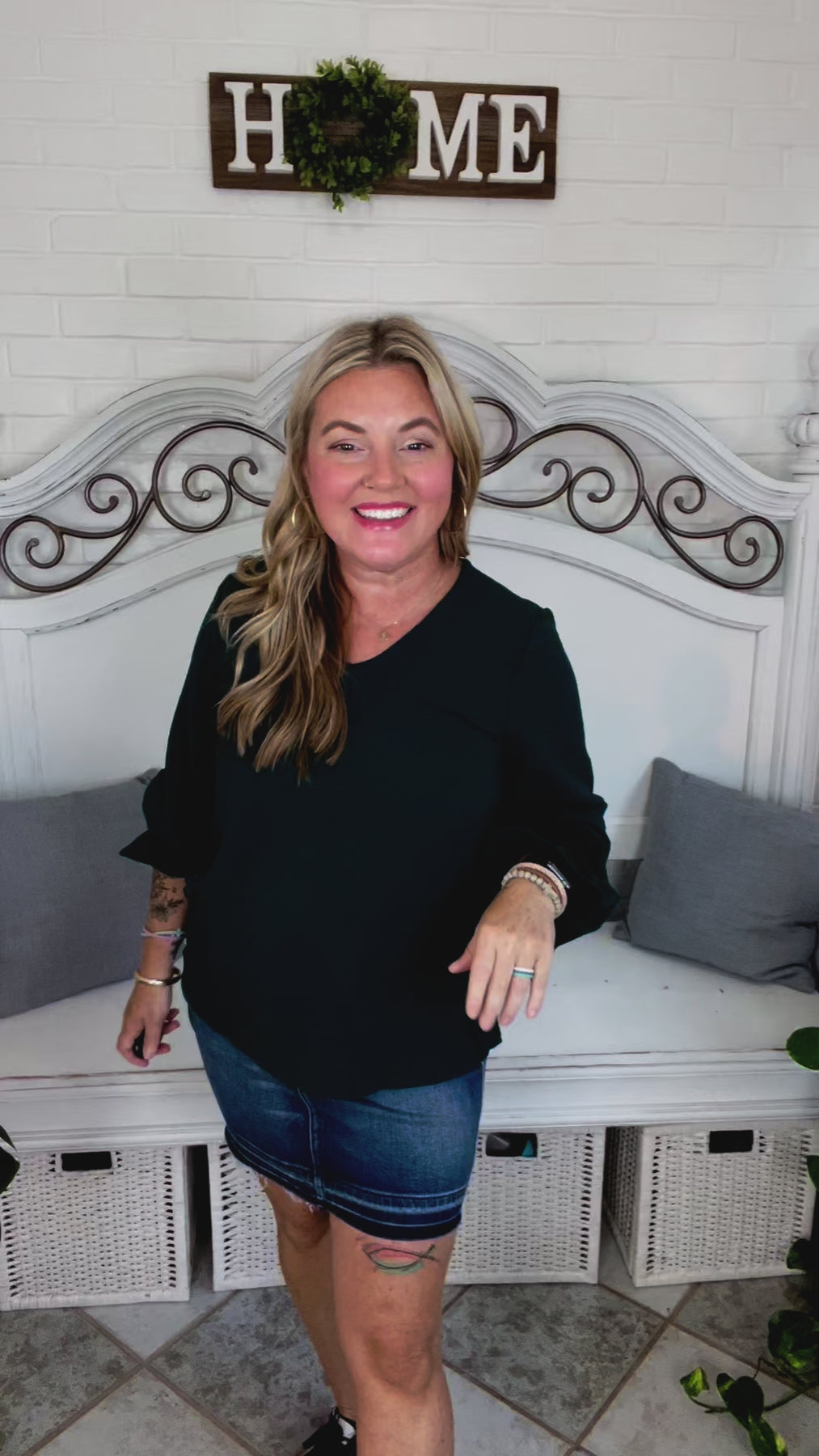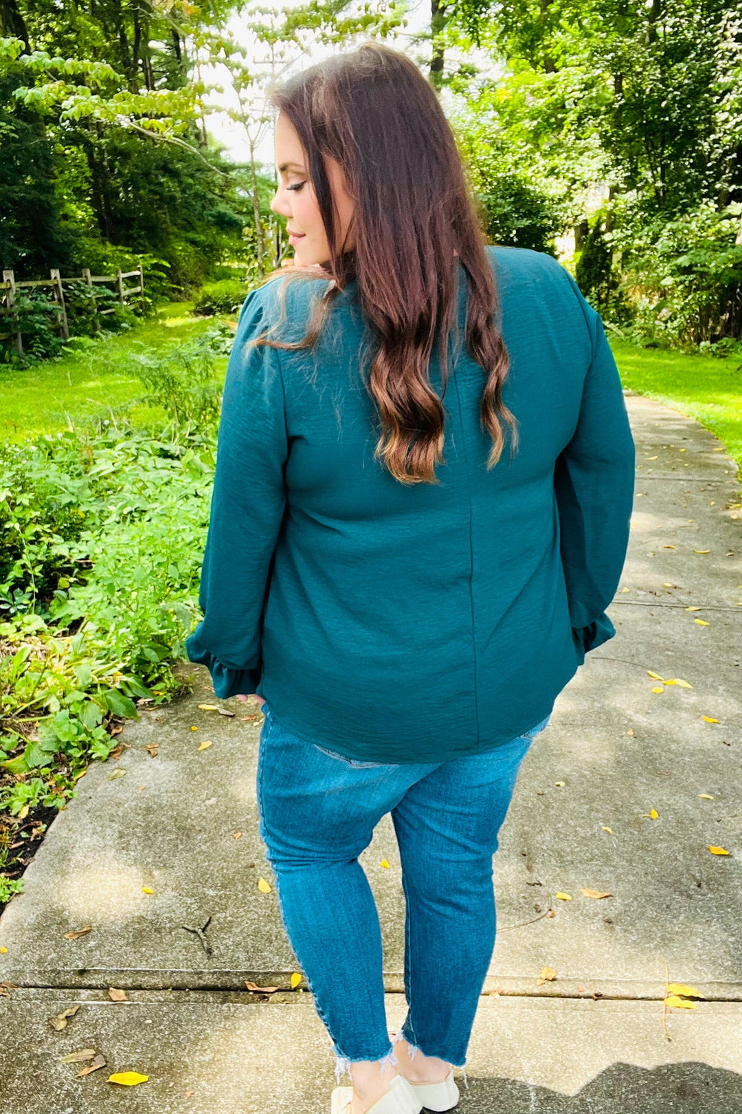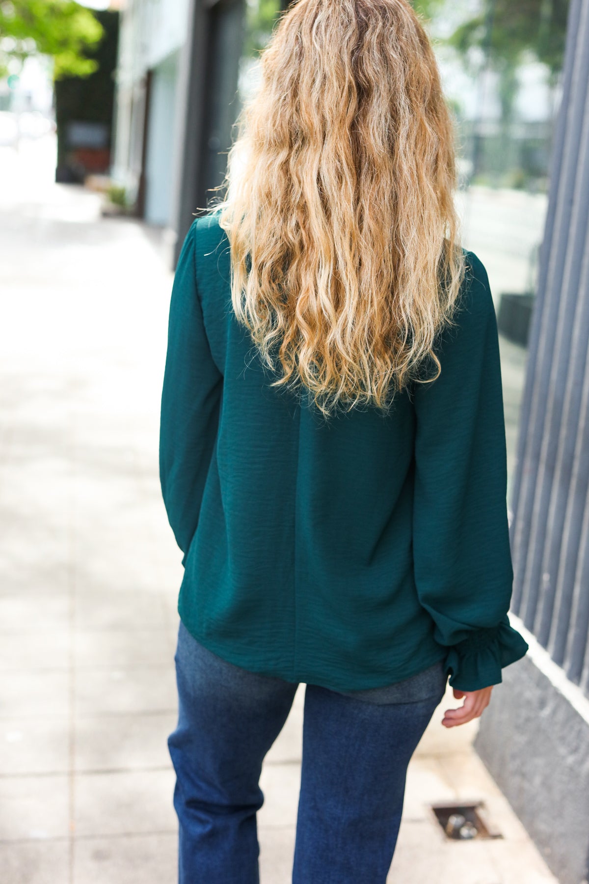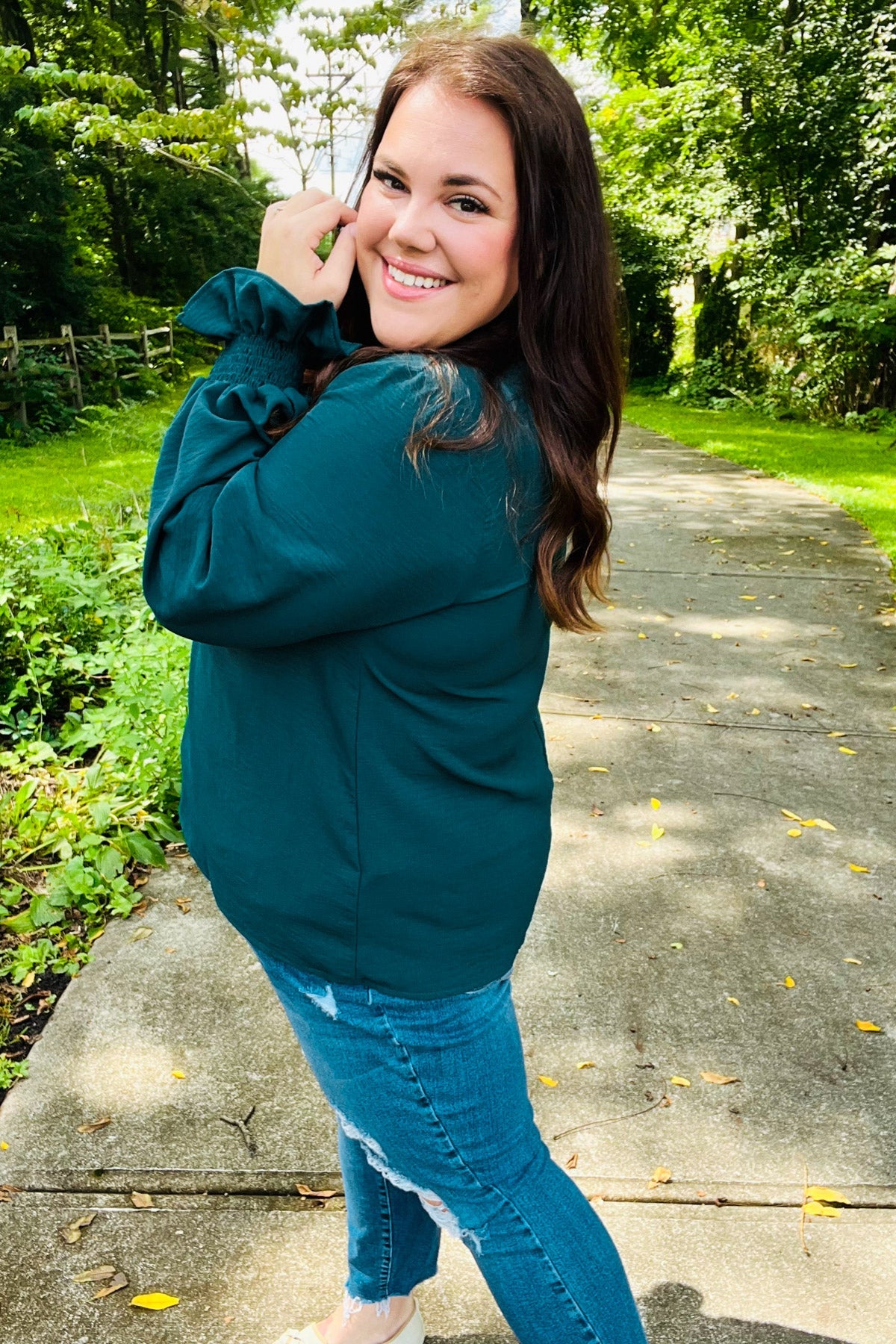 Donning a v-neck and smocked bubble sleeves, this stunning top has a lot of class and a flattering silhouette. Wear with jeans, slacks, or a skirt for the day-to-night style!