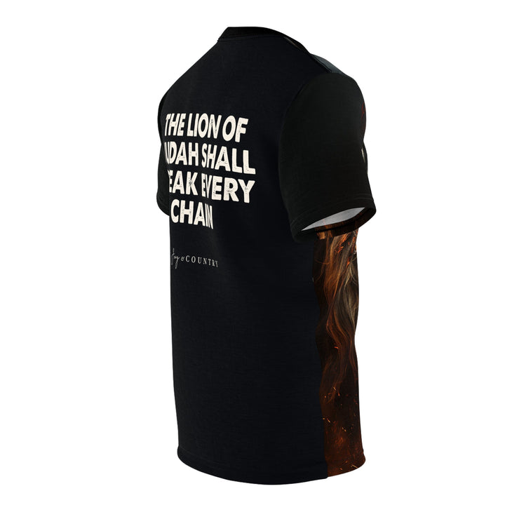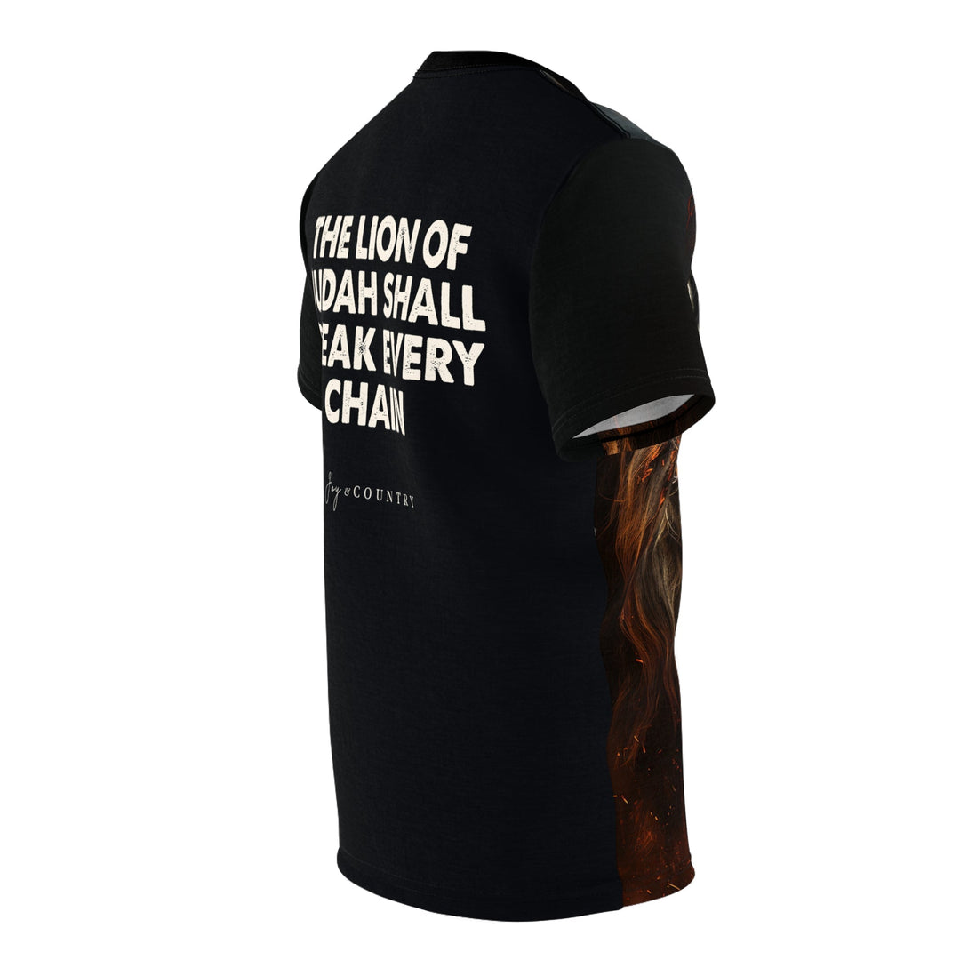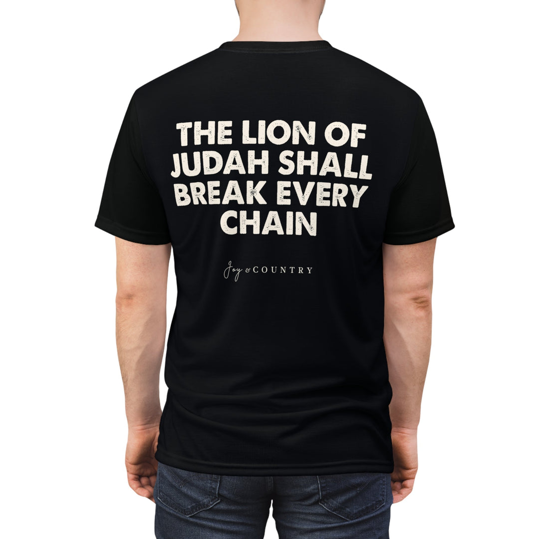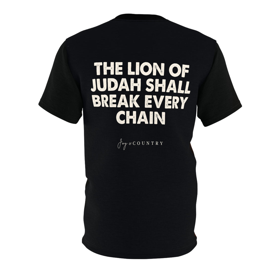 The Lion of Judah shall break every chain! This one-of-a-kind tee is a beacon of hope and light to inspire courage and faith in Jesus who wars on our behalf!