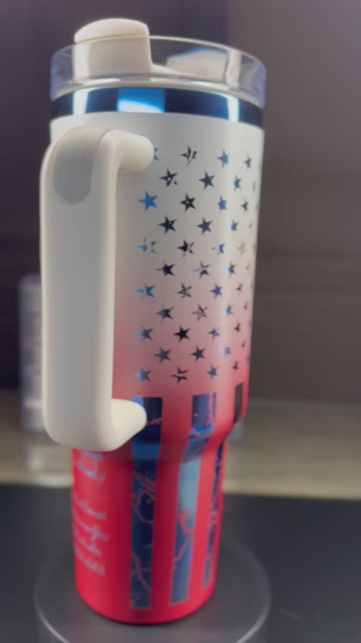 Stay refreshed and show your patriotic spirit with the Freedom USA Flag We The People 40 oz stainless steel XL tumbler. Designed with a high-quality laser-engraved American flag and "We The People" message, this tumbler is built for durability with double-walled, vacuum insulation to keep drinks hot for up to 6 hours or ice-cold for up to 12 hours. Available in our limited edition red and white ombre fade, its sleek, no-sweat design ensures a comfortable grip, while the splash-proof lid and reusable straw make it perfect for on-the-go use. Whether at work, on the road, or at a patriotic gathering, this tumbler is the ultimate combination of freedom, function, and American pride!