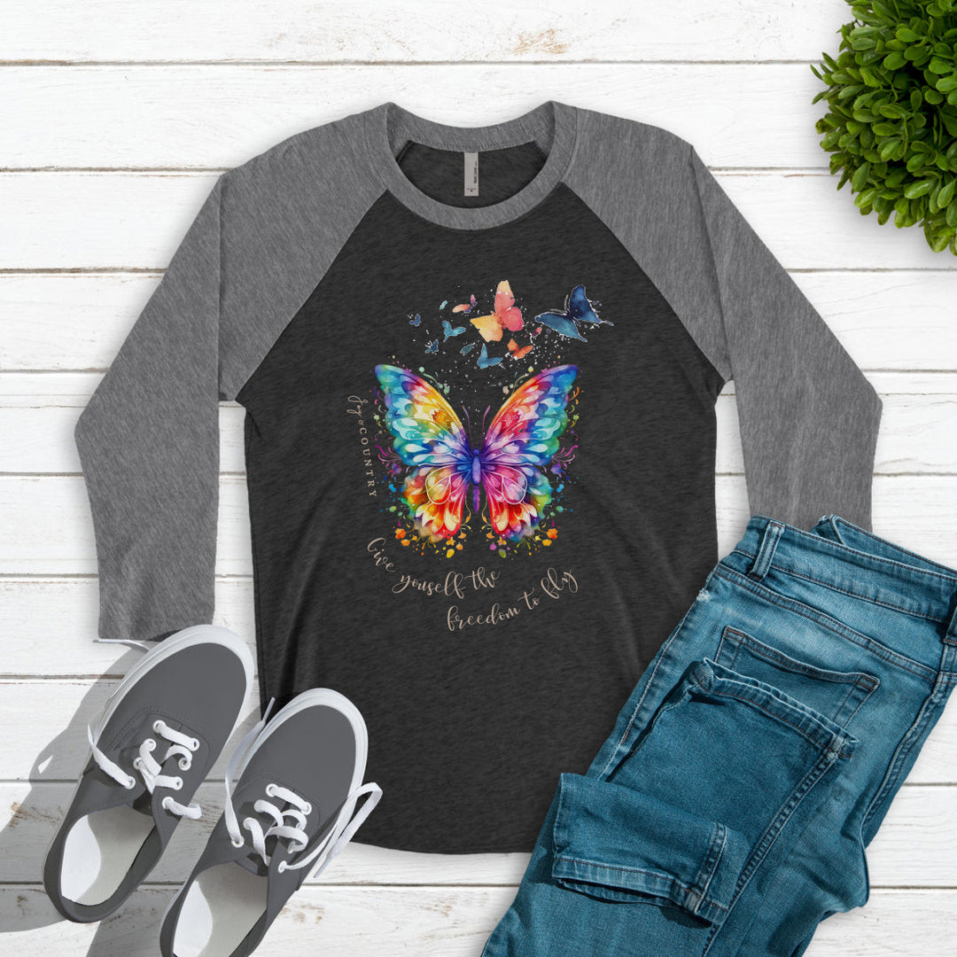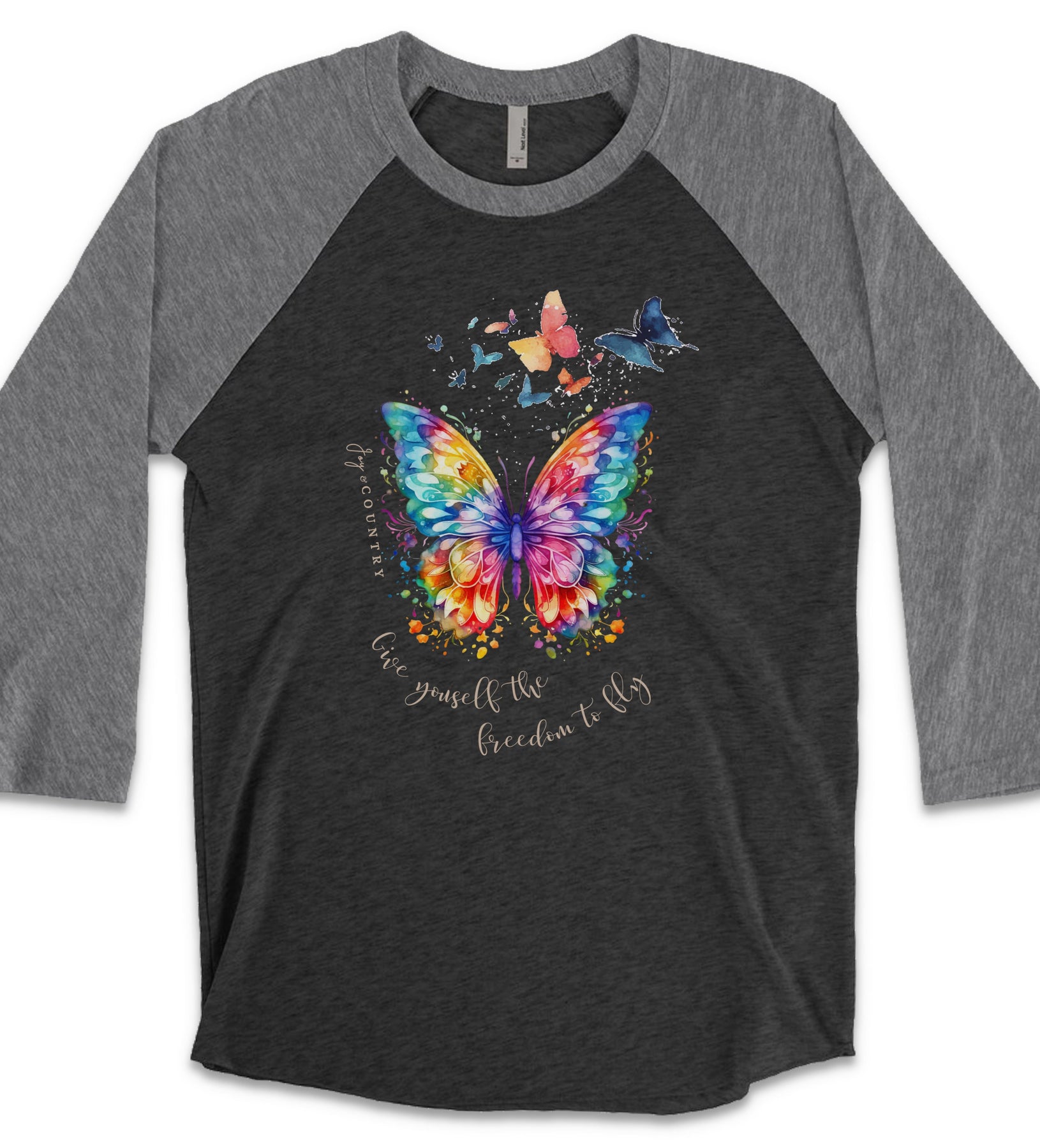 Give Yourself The Freedom To Fly - Butterflies - Unisex Tri-Blend 3/4 Sleeve Raglan Tee   Long-sleeve Joy & Country