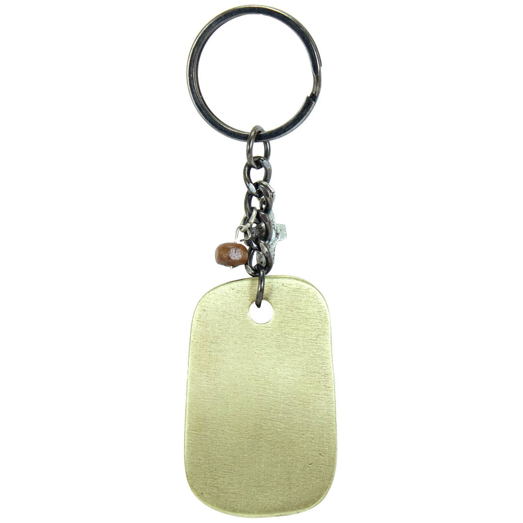 A gift a special someone to inspire them and remind them of how close God is to them, this metal engraved keychain is a beautiful sentiment. It is a crafted metal tag with oxidized gold finish, hematite finish ring and chain, with a wood bead and Cross charm.
