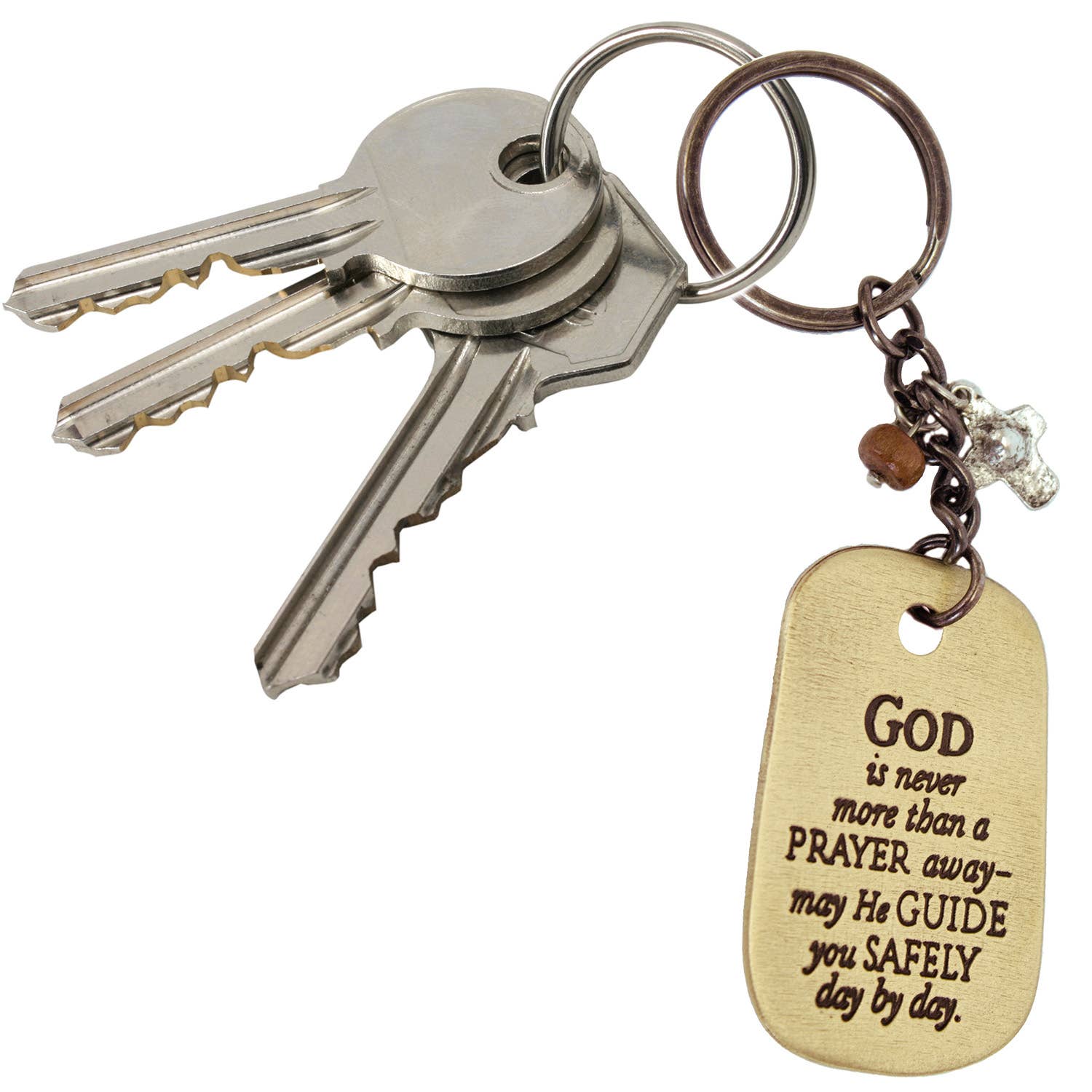 The keychain tag is inscribed with blessings and reads “God is never more than a prayer away - may He guide you safely day by day.”