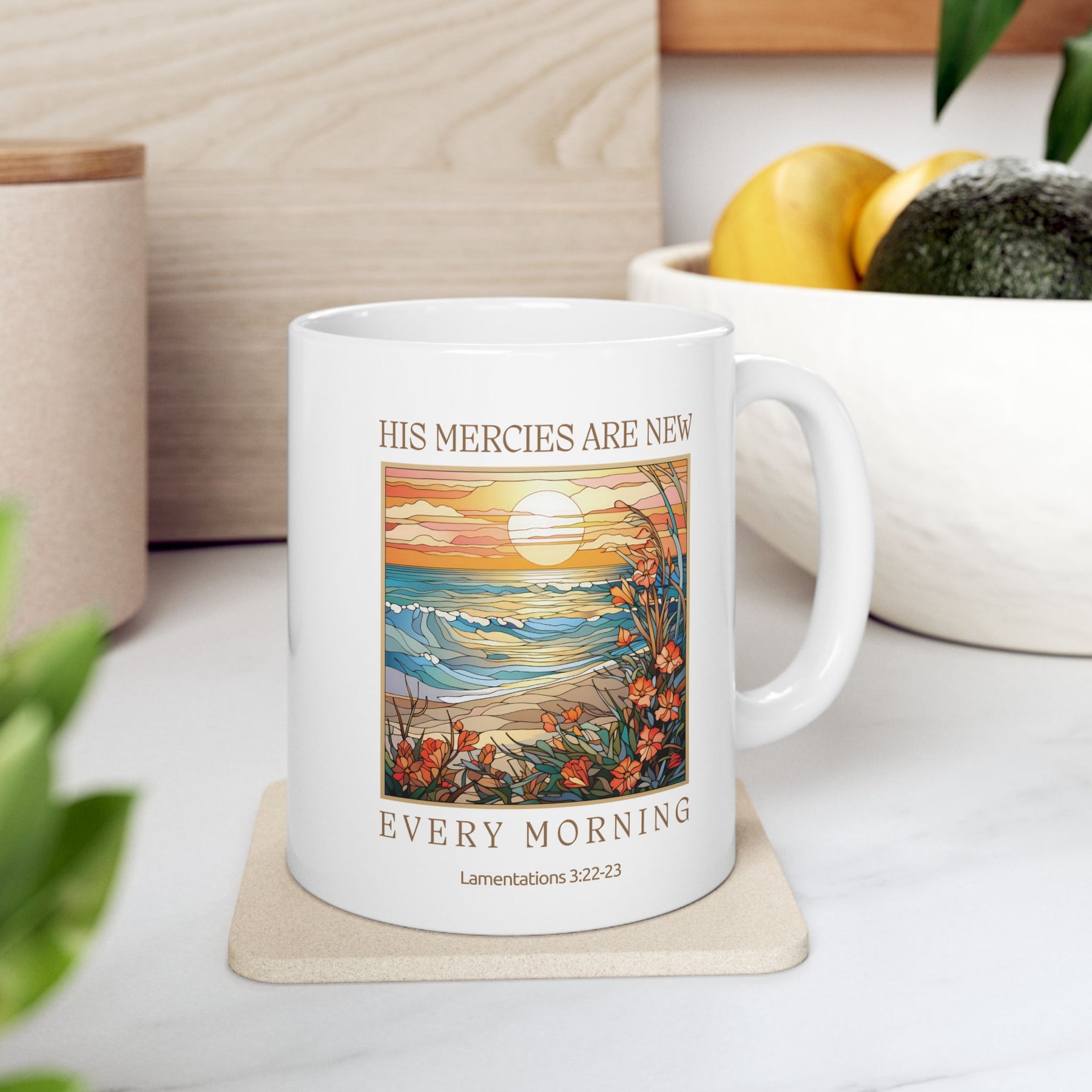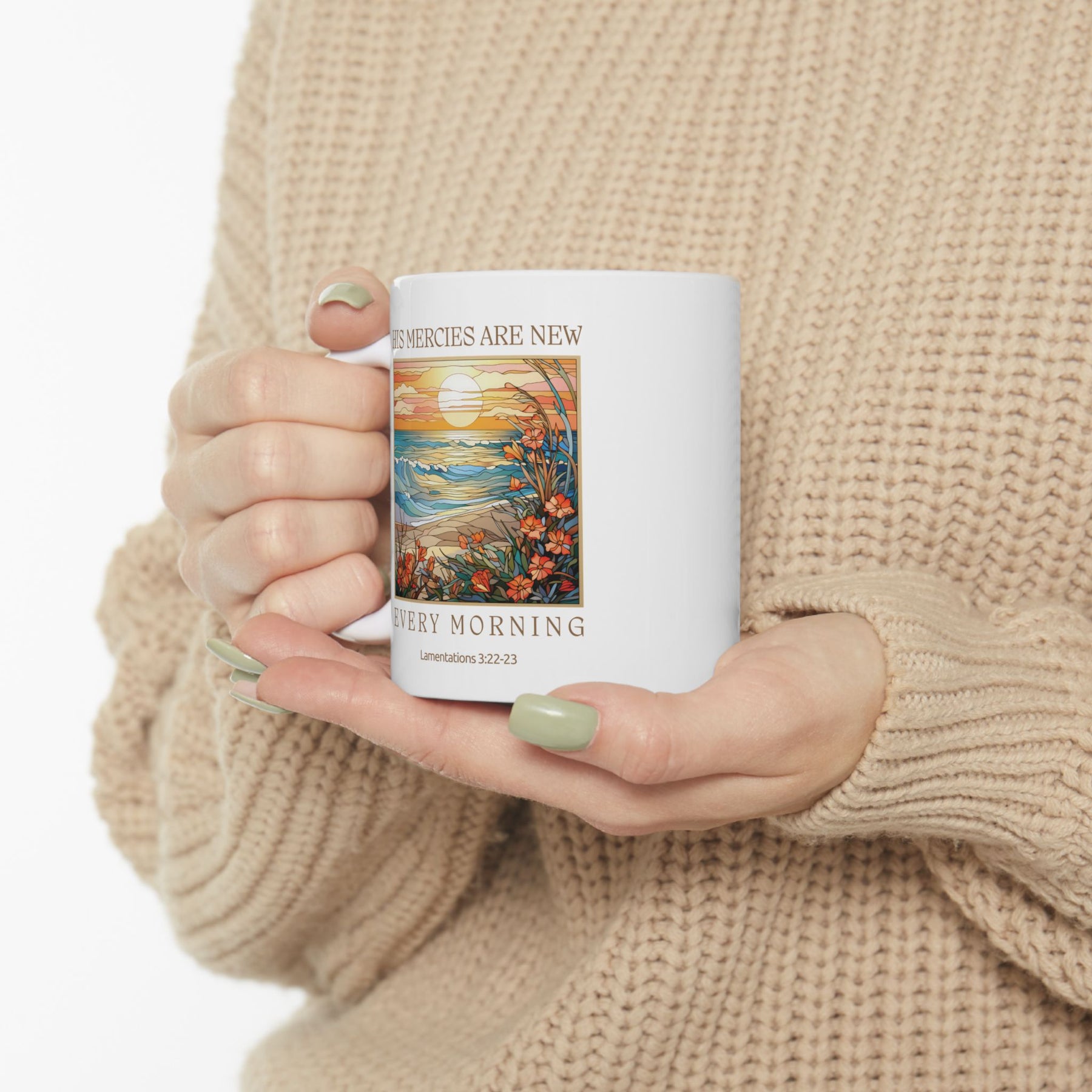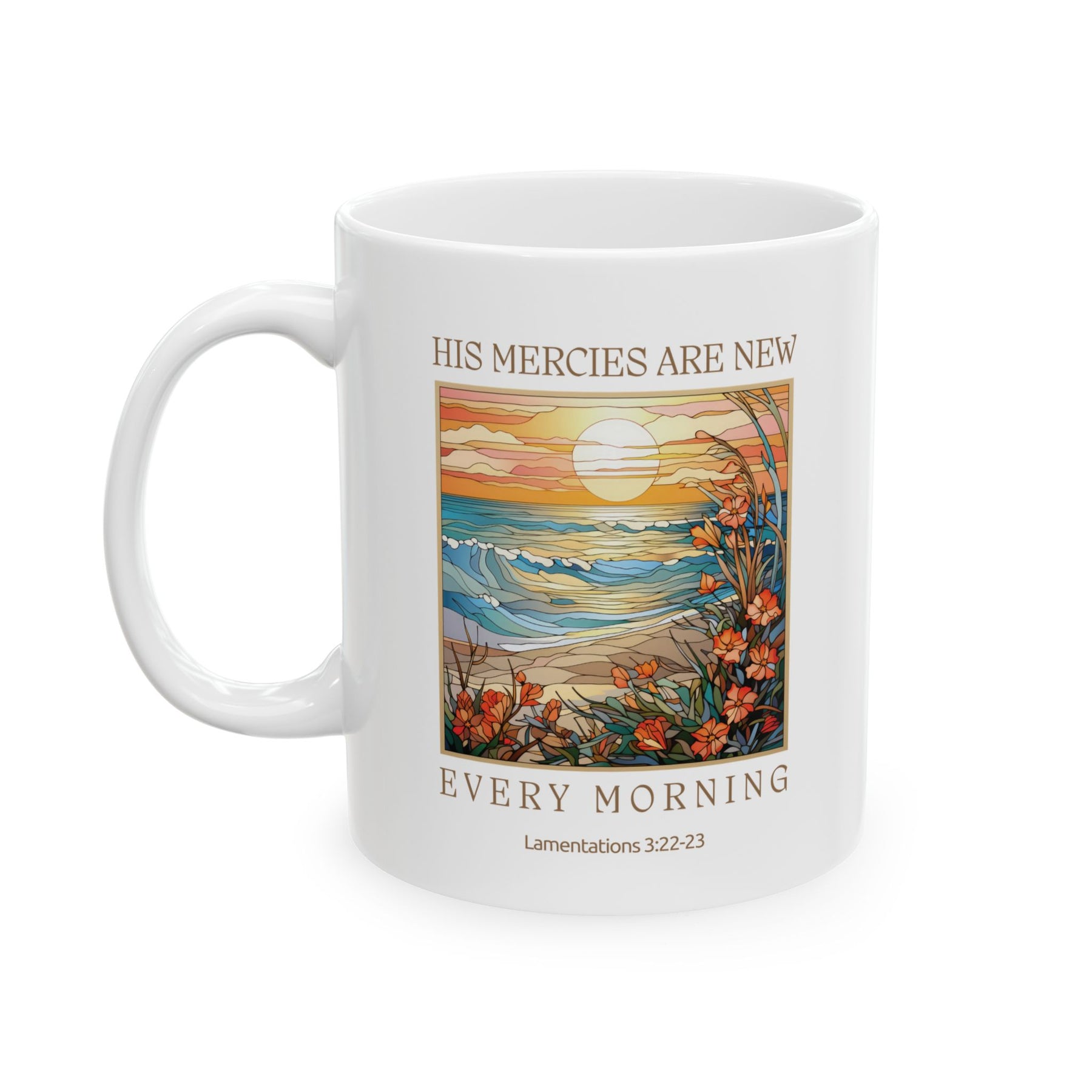 The steadfast love of the Lord never ceases, his mercies never come to an end; they are new every morning; great is your faithfulness." Lamentations 3:22-23. His mercies are new every morning. Thank you Lord for your faithfulness! This mug is a beautiful representation of the love and mercy of God, which never fails.
