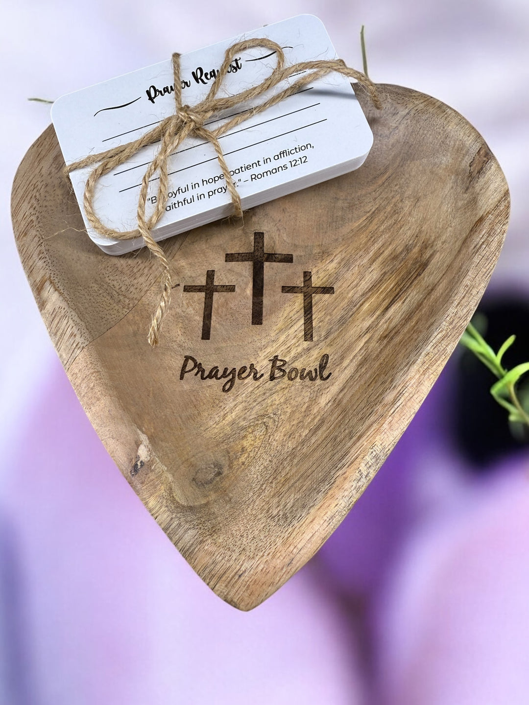 Hold space for hope and reflection with this Mango Wooden Heart Prayer Bowl, thoughtfully carved into a heart shape from natural mango wood—making each piece beautifully unique. Featuring a delicate flower cross engraving at its center, this sturdy 6" x 6" bowl comes with 25 prayer cards, perfect for writing down prayers, praises, or promises. Elegantly boxed for gifting, it's a meaningful addition to any home, devotional space, or sacred moment.