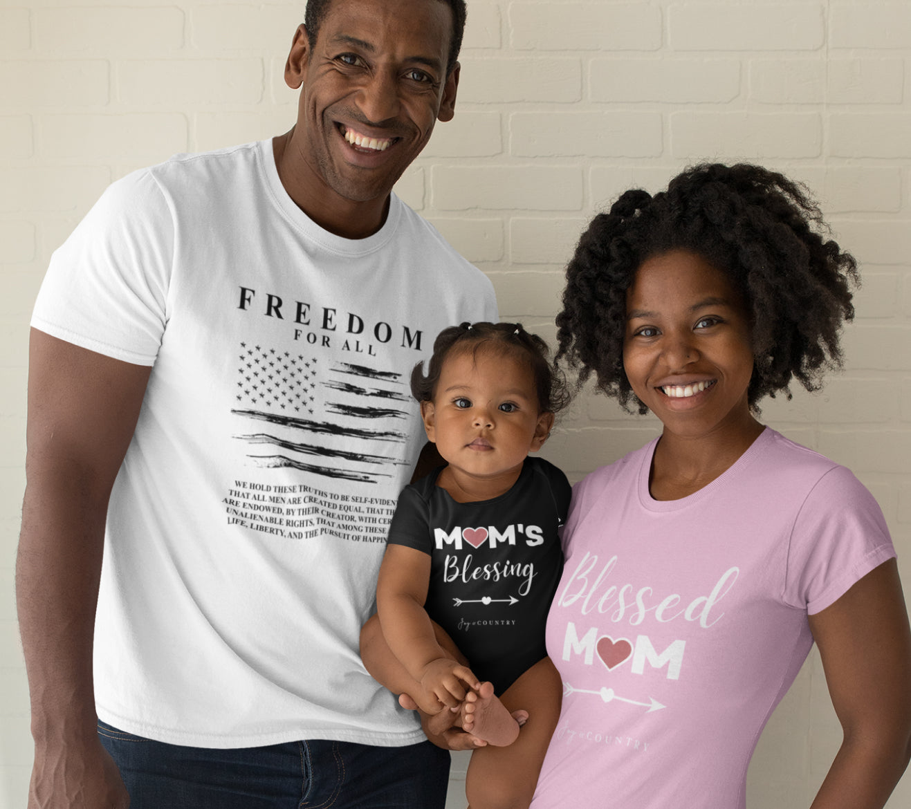 Shown here with our Blessed Mom tee and Freedom for All tee for adults.
