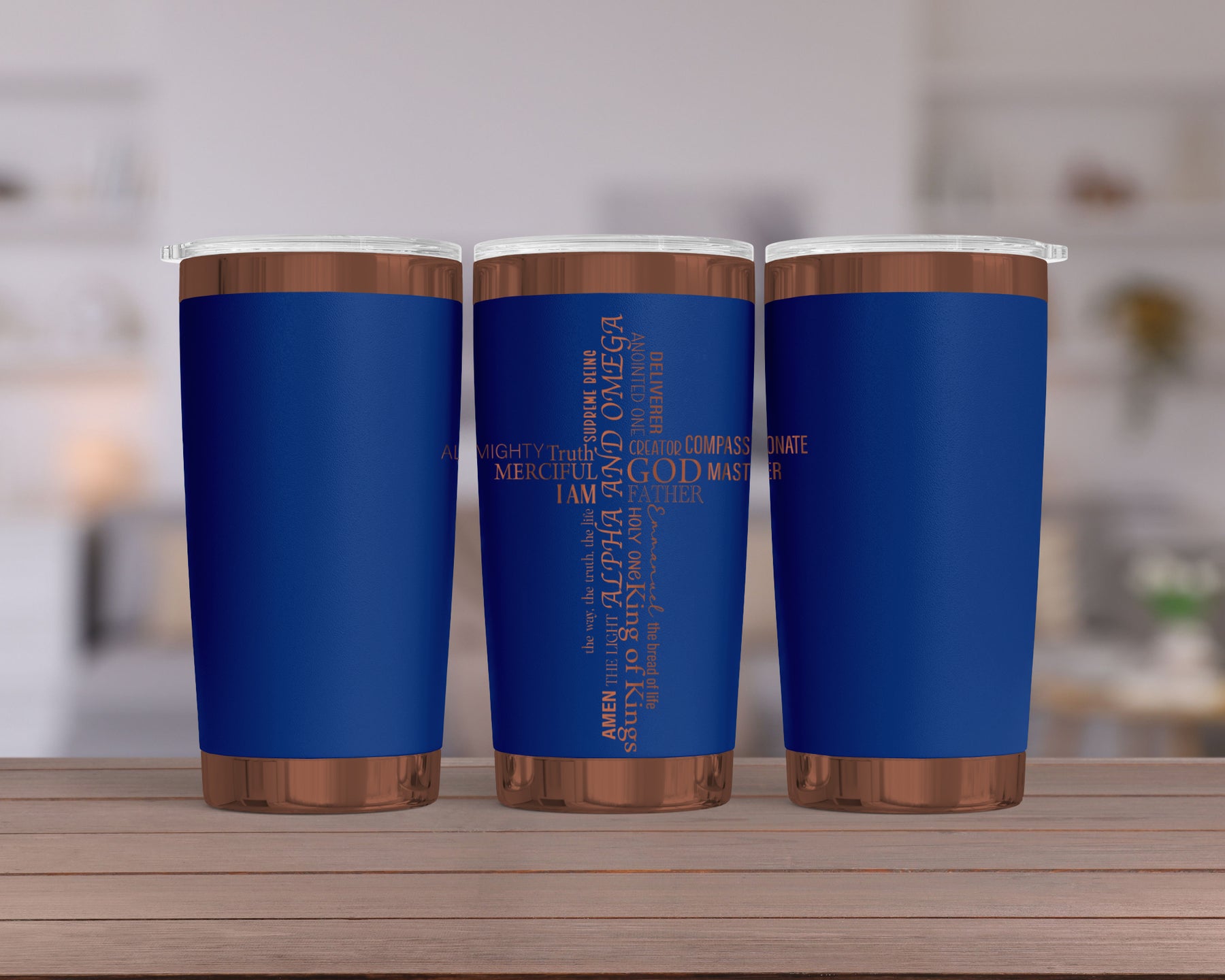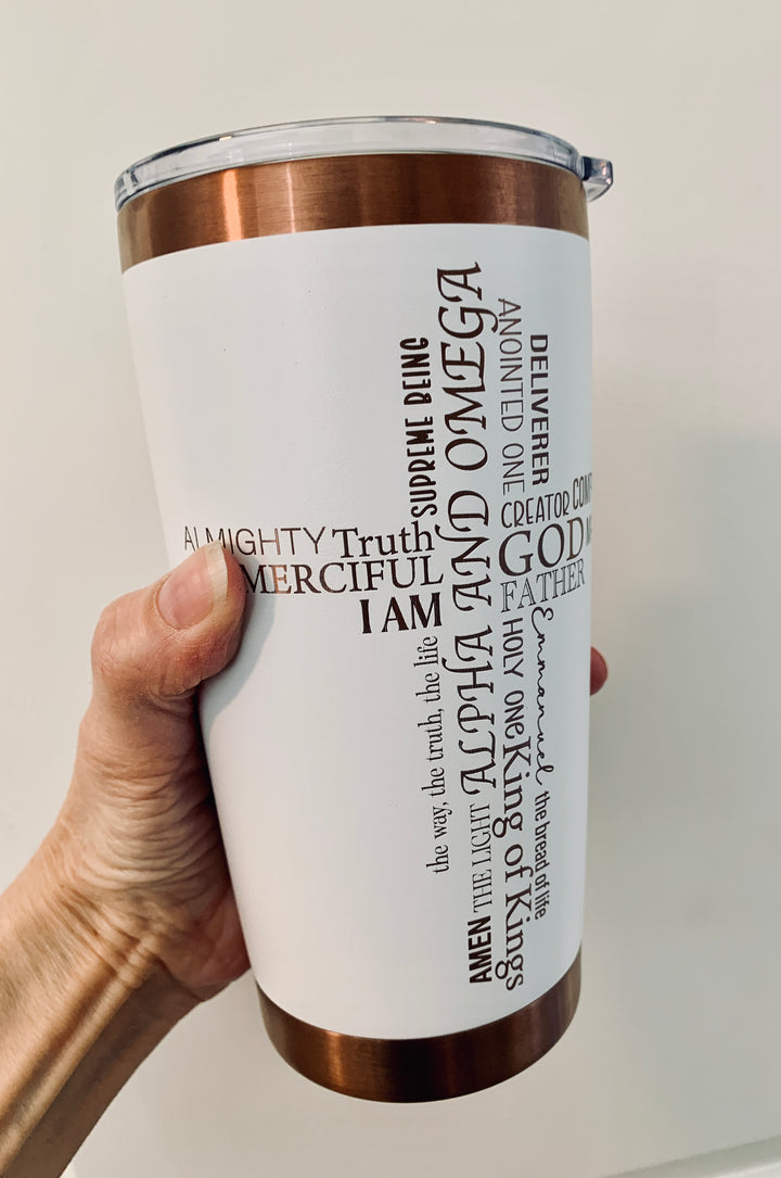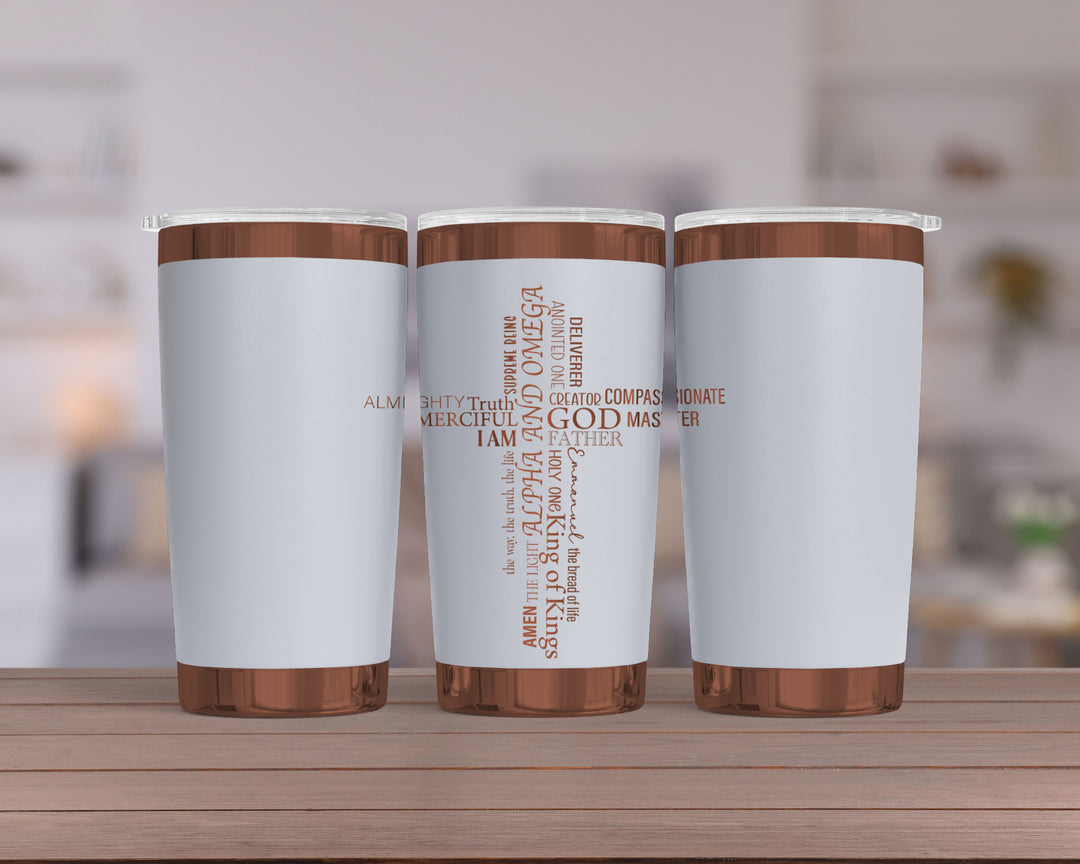 Stay refreshed and uplifted with the Names Of God 20 oz stainless steel tumbler. Featuring a high-quality laser-engraved design, this tumbler is crafted for durability with double-walled, vacuum insulation to keep drinks hot for up to 4 hours or ice-cold for up to 9 hours. The no-sweat body is perfect for daily inspiration, travel, or outdoor adventures. Available in our stunning premium copper against your choice of background color, this tumbler comes complete with a splash-proof sliding lid, offering the perfect blend of faith, function, and style!