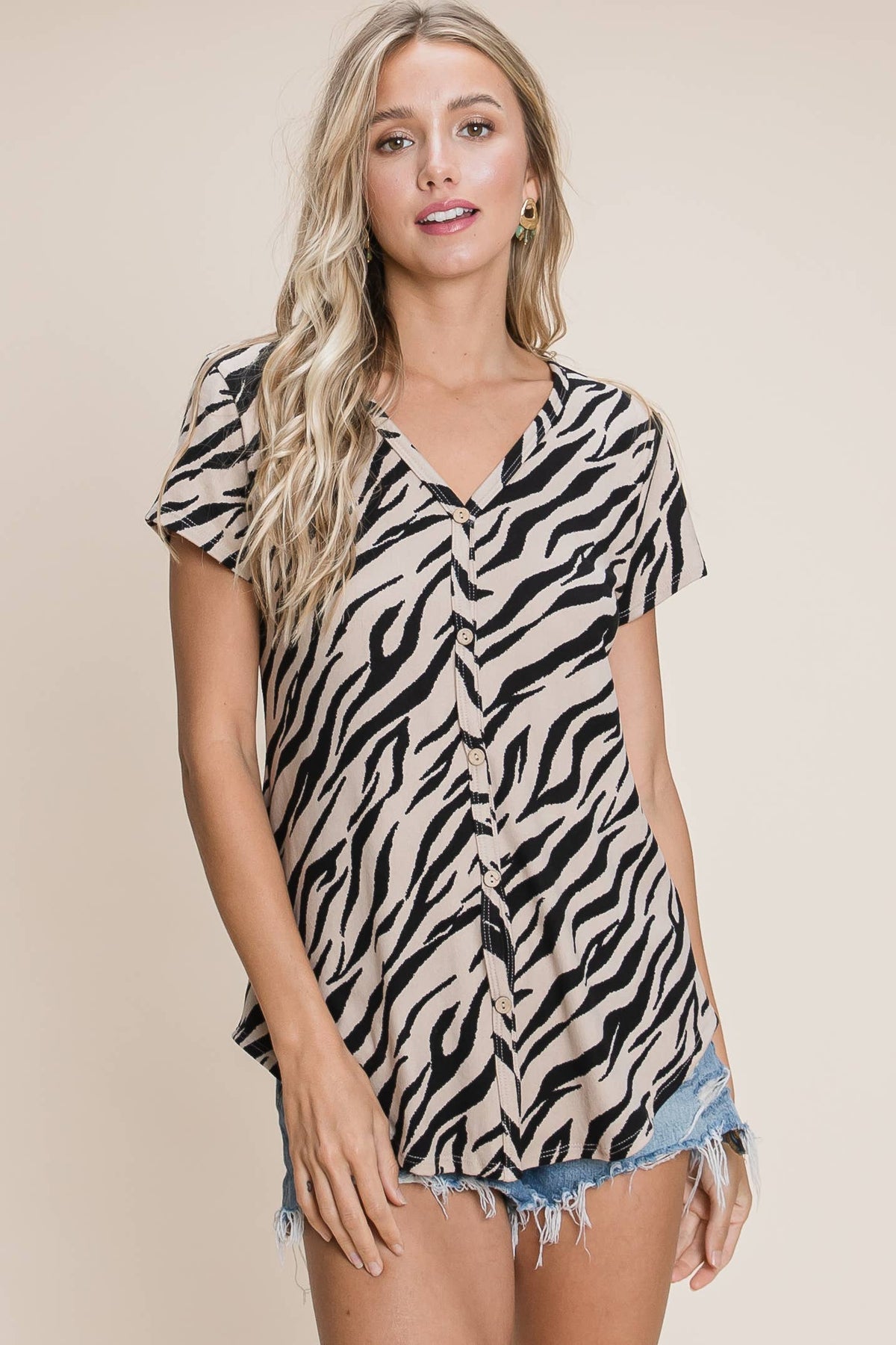 Make a splash with our Passionate Purpose Soft Zebra-Print Top! This super soft and cozy short-sleeve wonder boasts a playful zebra pattern and flattering v-neck that'll have heads turning. The lightweight, dreamy fabric caresses your skin while keeping you breezy and comfy from dawn till dusk. Perfect for casual outings, coffee dates, or relaxing at home, this breathable beauty pairs effortlessly with jeans, shorts, or skirts. Embrace your wild side with a top that's as bold and fabulous as you!