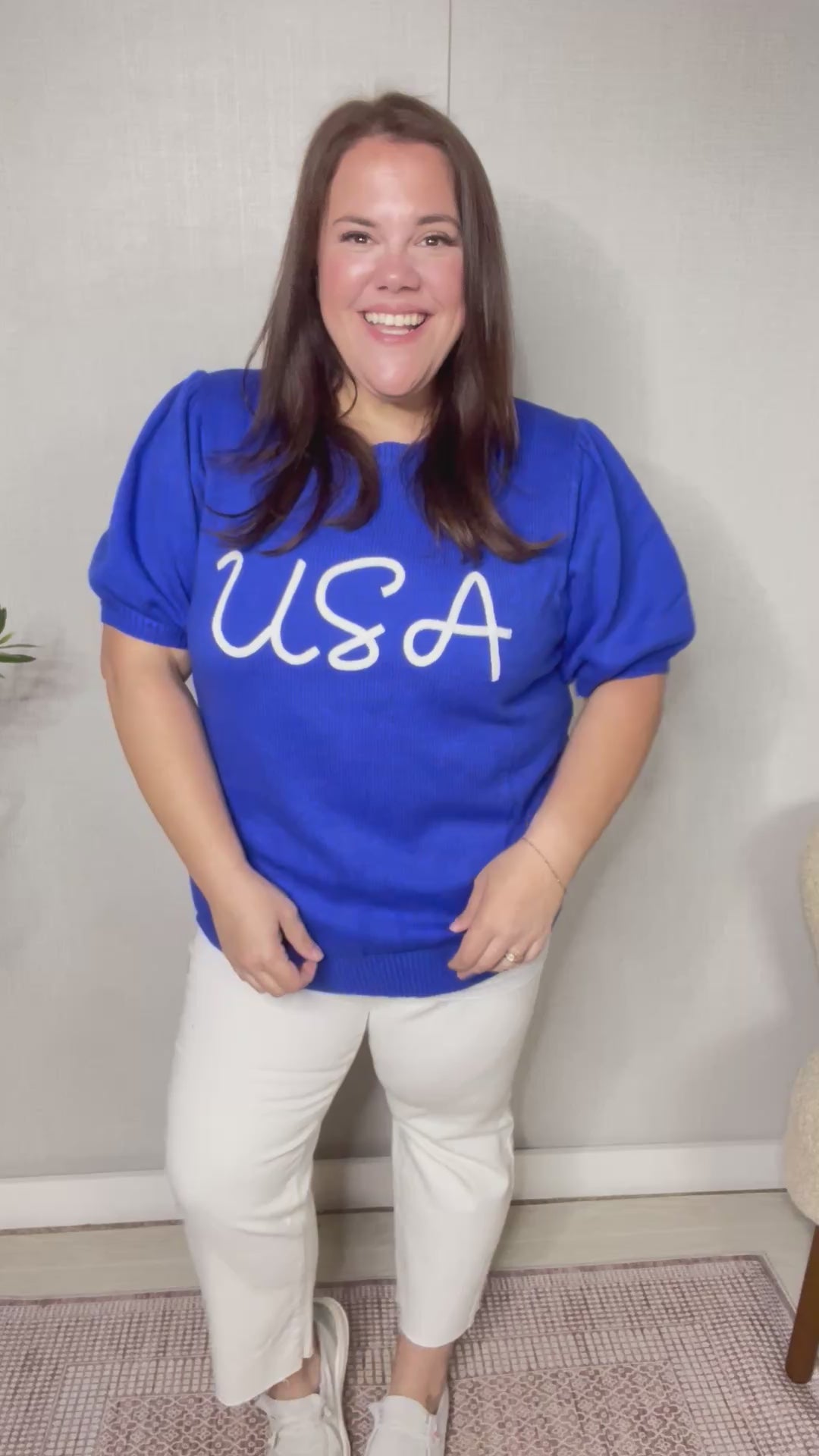 Slip on this pop-up "USA" embroidered sweater top featuring a round neck, short puff sleeves and soft knit for your next BBQ or 4th of July festivities. Get your patriotic on with this fun sweater top!