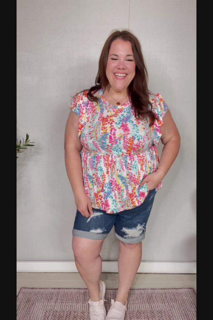 Handled It - Floral Leaf Print Babydoll Top - Ivory   Short-Sleeve Tops Joy & Country