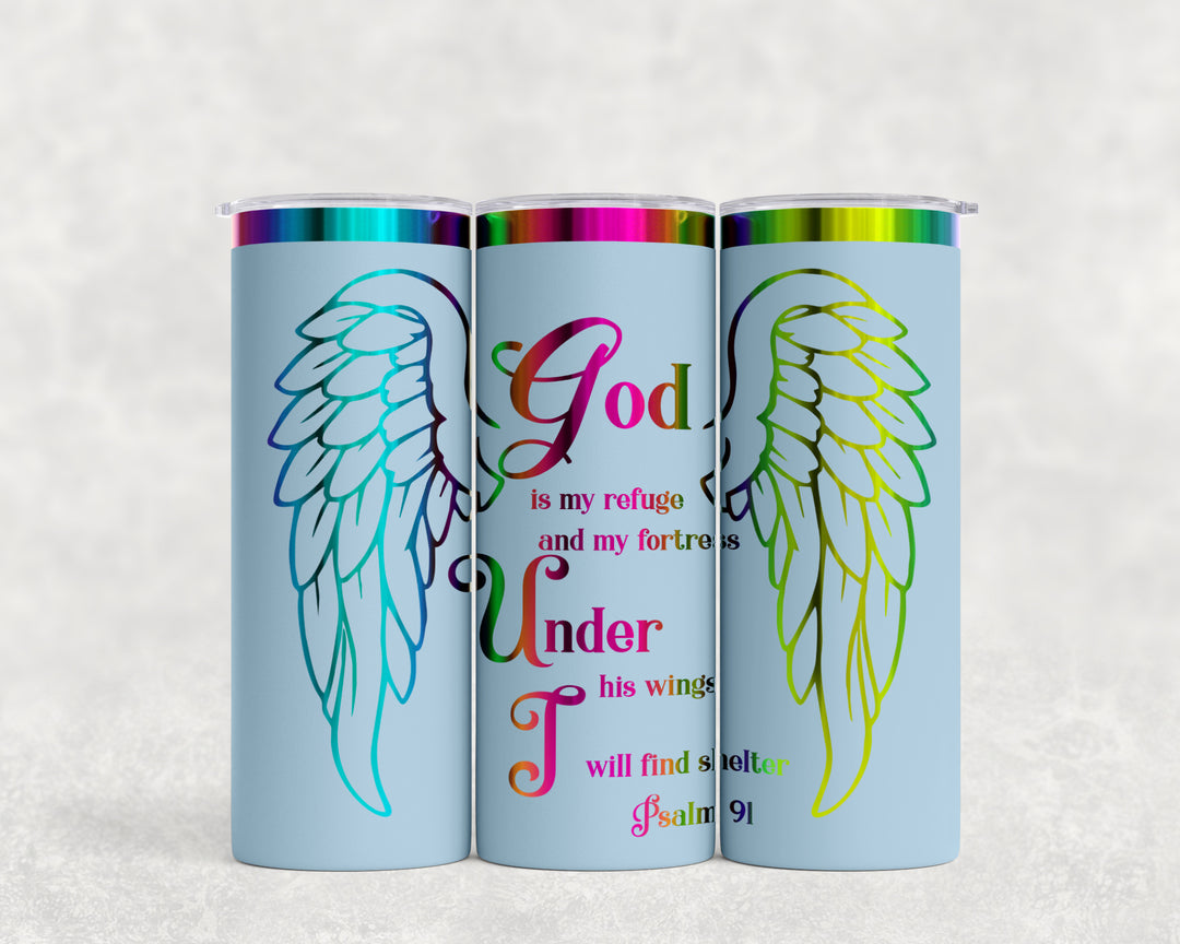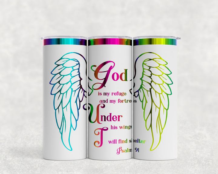 [PRE-ORDER] Psalm 91 Wings God Is My Refuge Multicolor Iridescent - 20 oz. Stainless Steel Laser-Engraved Skinny Tumbler [SHIPS IN 1-2 WEEKS]