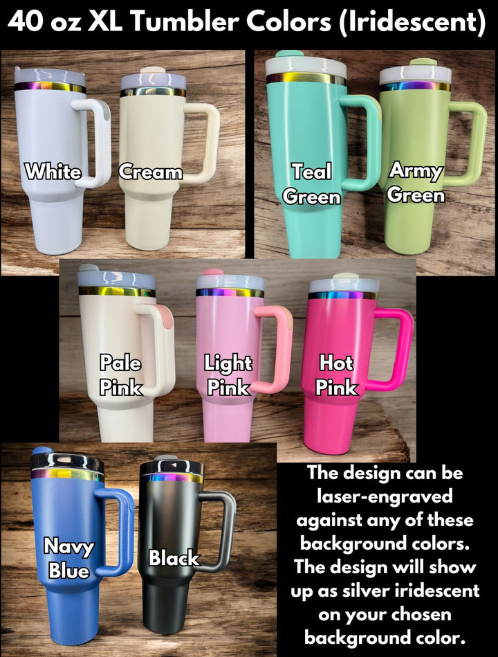 - Design/text will show up as multicolor iridescent against your chosen color background. NOTE that the exact placement of iridescent colors in the design may not match the images 100%. While the tumblers will have similar colors and iridescence, it may vary slightly from unit to unit.