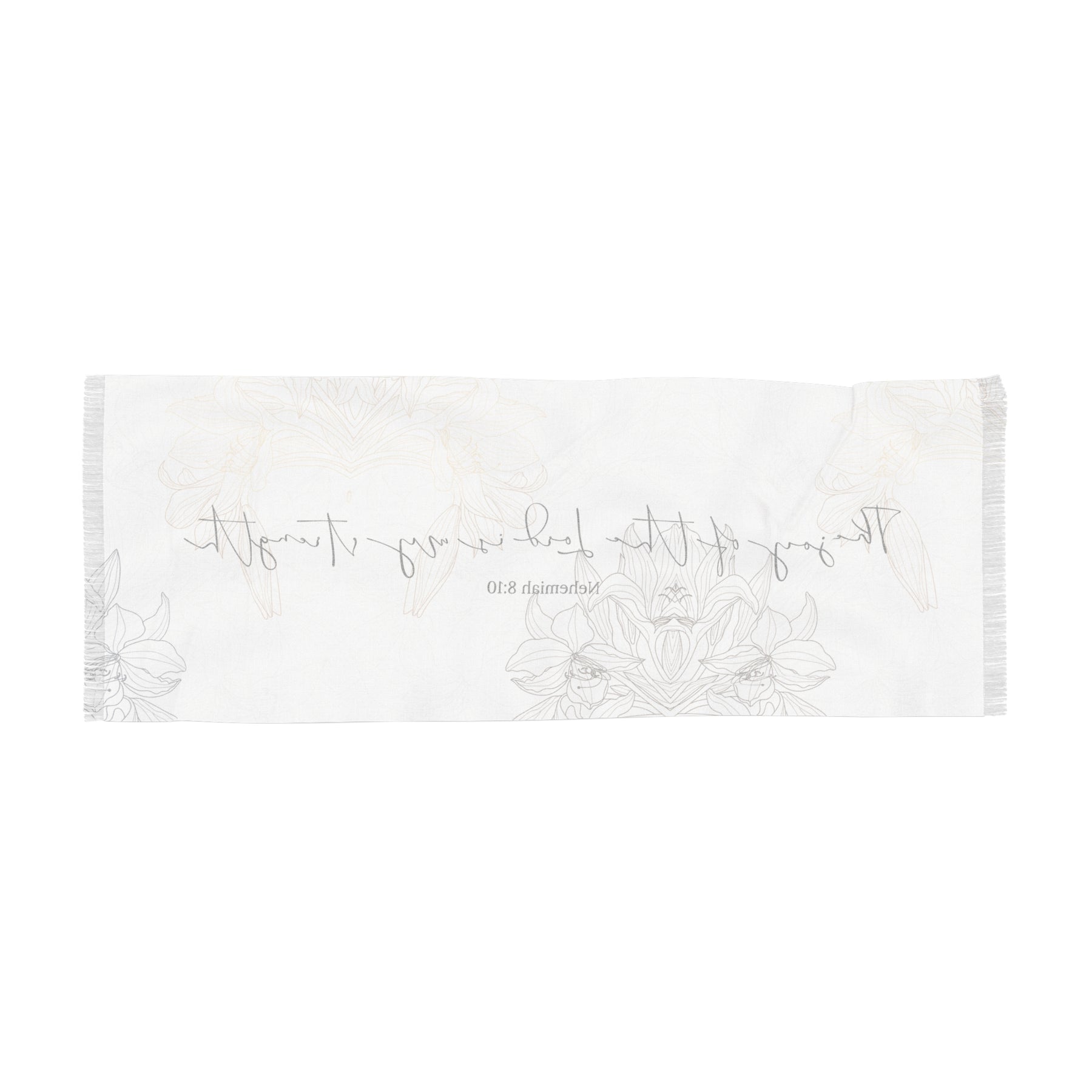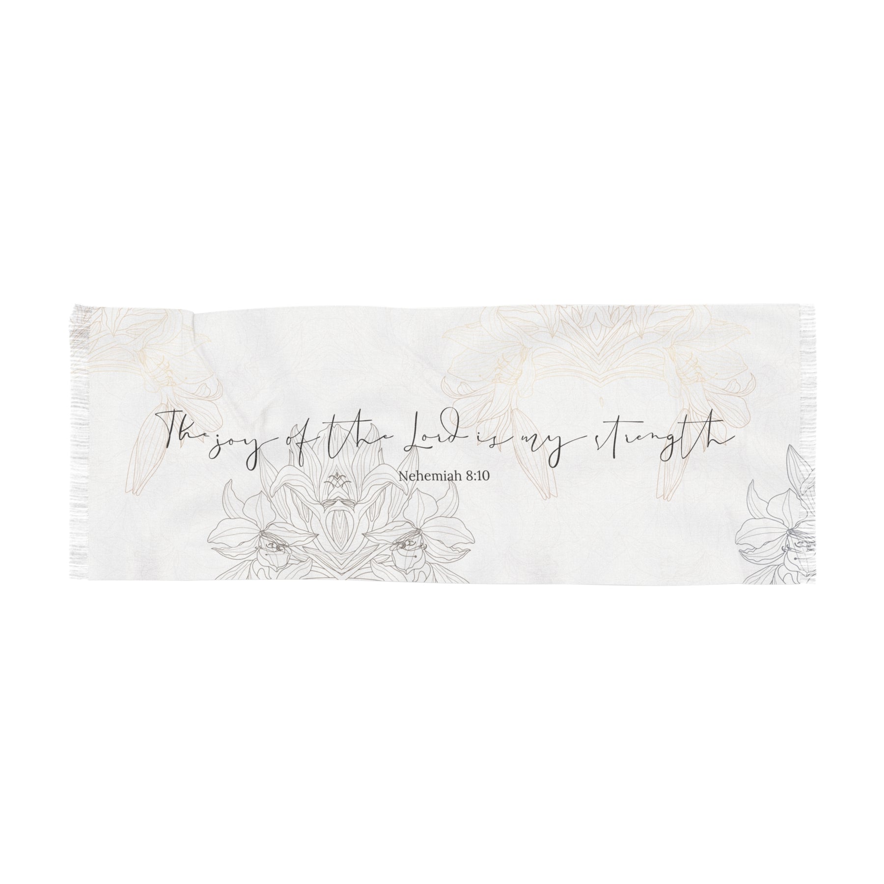 This scarf is near and dear to our hearts. Let me tell you the story of how this scarf came to be. When I was contemplating what Scripture to put on this beautiful floral backdrop, I was thinking about something around peace and calm. But, I then felt inspired by the Holy Spirit to add "The joy of the Lord is my strength." I was puzzled at first because I associate joy with brightness and more movement. I wouldn't associate this Scripture with a calming, floral, neutral palette. But then I got it! When you access God's joy, true joy, it changes you from the inside out. In His presence is fullness of joy! When I experience God's joy, it not only gives me happy feelings, but it's so much more than that. It settles my soul and gives me a peace that no worldly circumstances can shake. It's a deep knowing and a strong fortress that feels safe, calming, and grounding, regardless of the chaos that is happening in my life. God's joy IS YOUR STRENGTH! And that strength goes deep and calms the chaos and the storms.